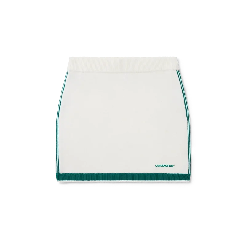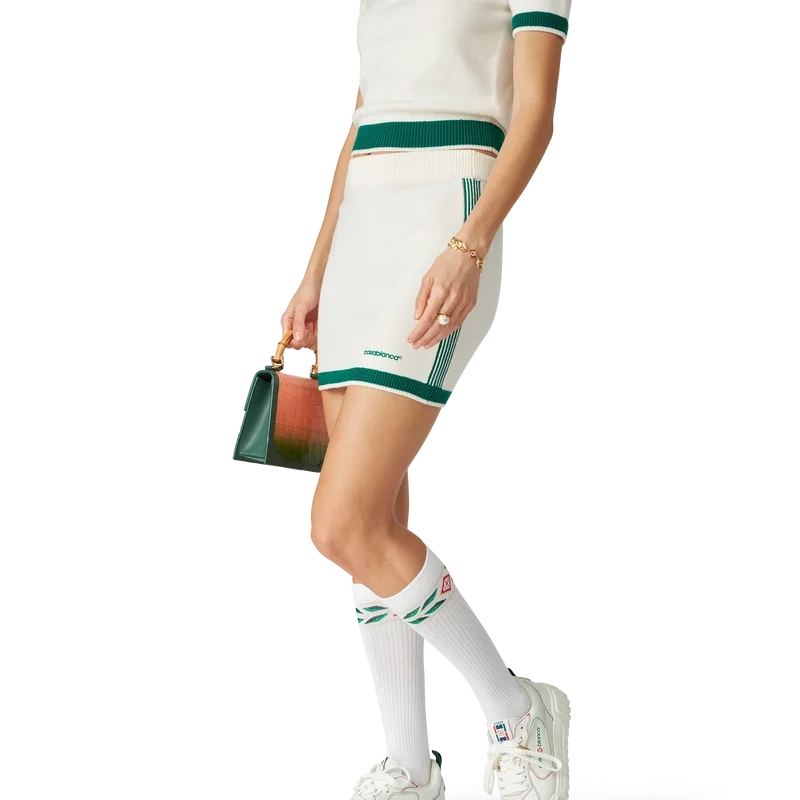 La falda de tenis de punto es una minifalda ajustada confeccionada en tejido de lana merino. Cuenta con una cintura elástica, ribete en contraste en el dobladillo, rayas a los lados y el logotipo de Casablanca.