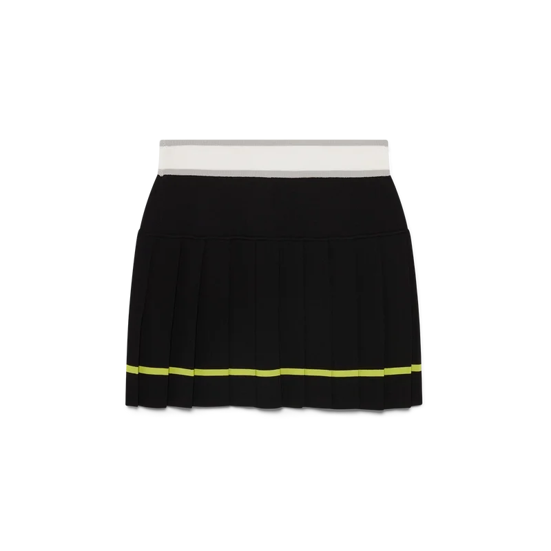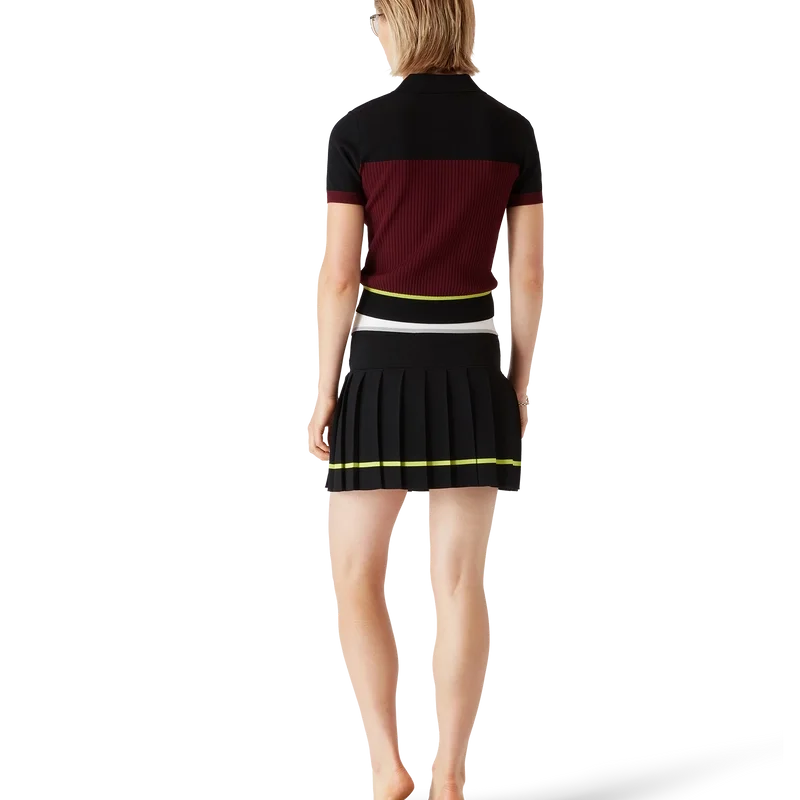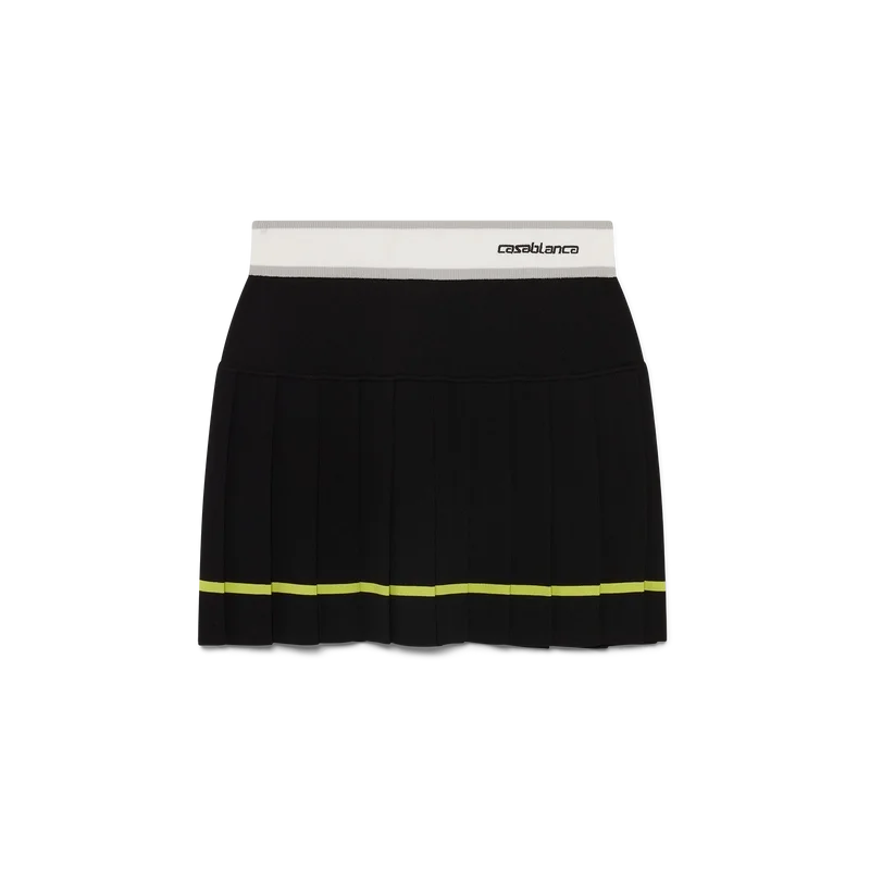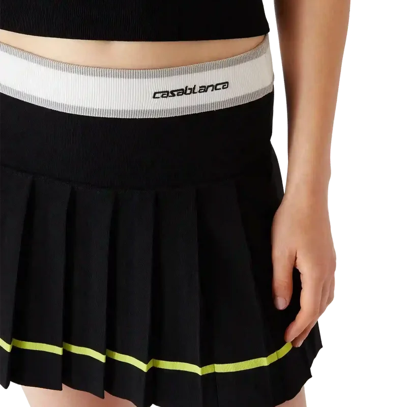 La falda plisada a rayas es de estilo mini, con una silueta estructurada que refleja el enfoque de atelier de la casa hacia la ropa deportiva. Se completa con una cintura elástica con el logotipo de Casablanca, un canesú liso y un panel plisado con detalle de rayas amarillas en el dobladillo.