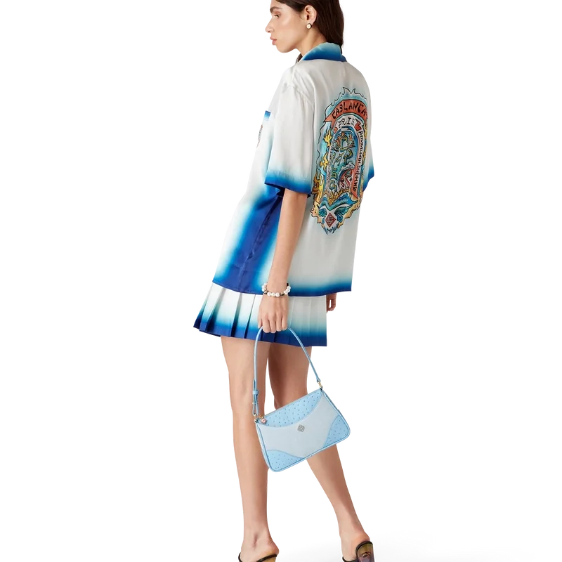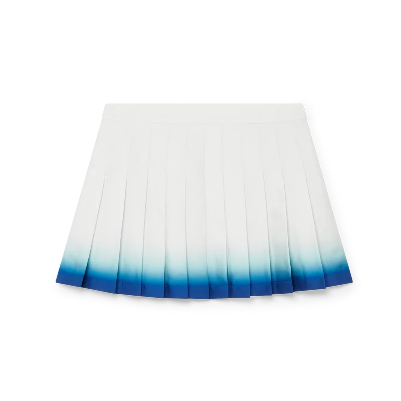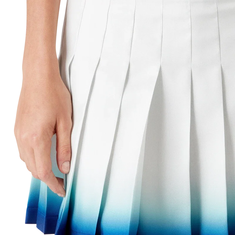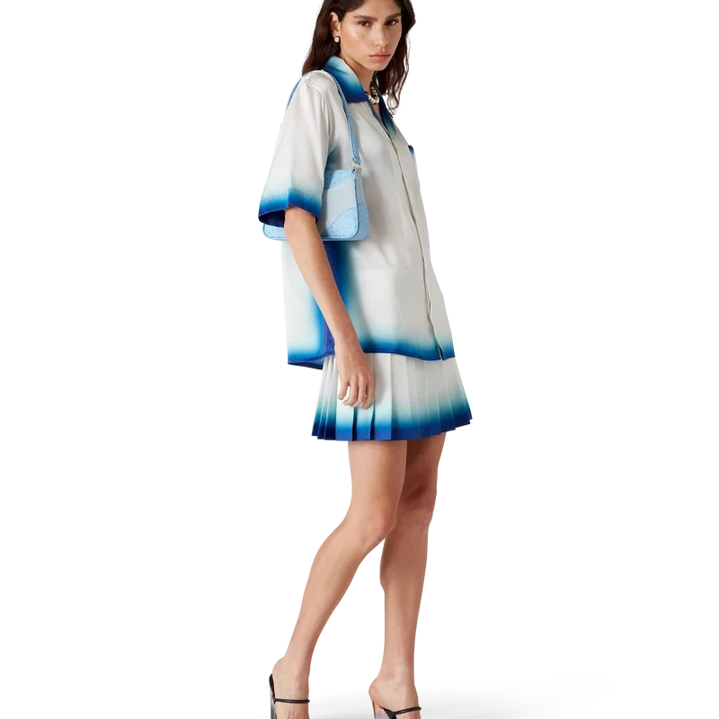 La falda plisada Casa Way Skate es un modelo de pantalón corto confeccionado en tejido de sarga de seda. Cuenta con cinturilla, pliegues, detalle de dobladillo horizontal con degradado azul, cierre lateral con cremallera y forro.