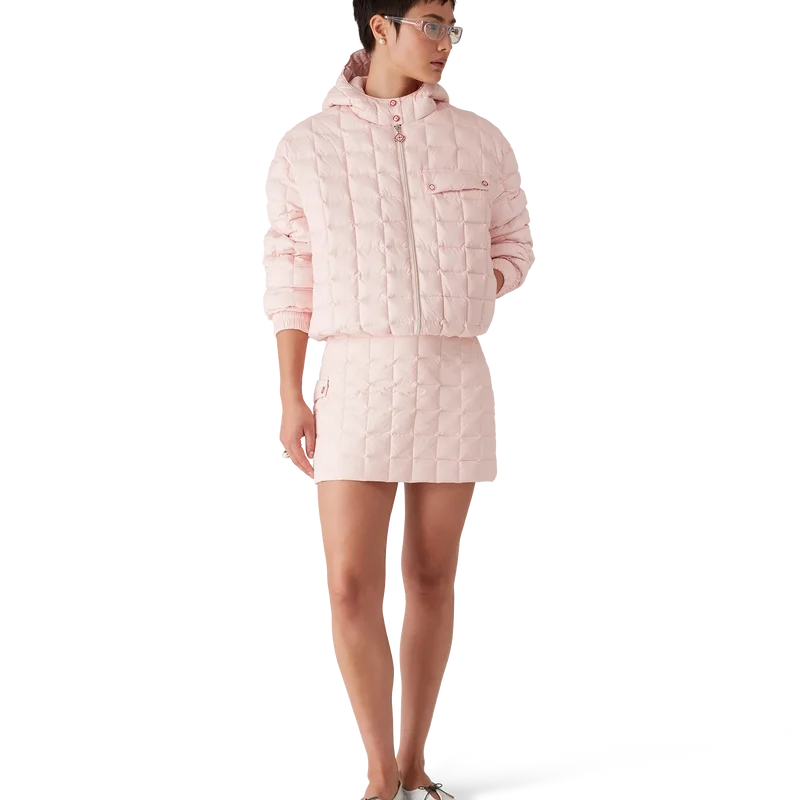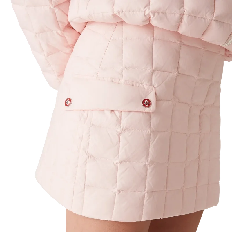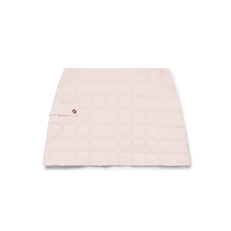La minifalda acolchada de nylon tiene un diseño en línea A con un patrón acolchado cuadrado. Se completa con un cierre de cremallera y un bolsillo con solapa que cuenta con los botones a presión planos esmaltados y chapados en oro con el logotipo entrelazado de la casa.