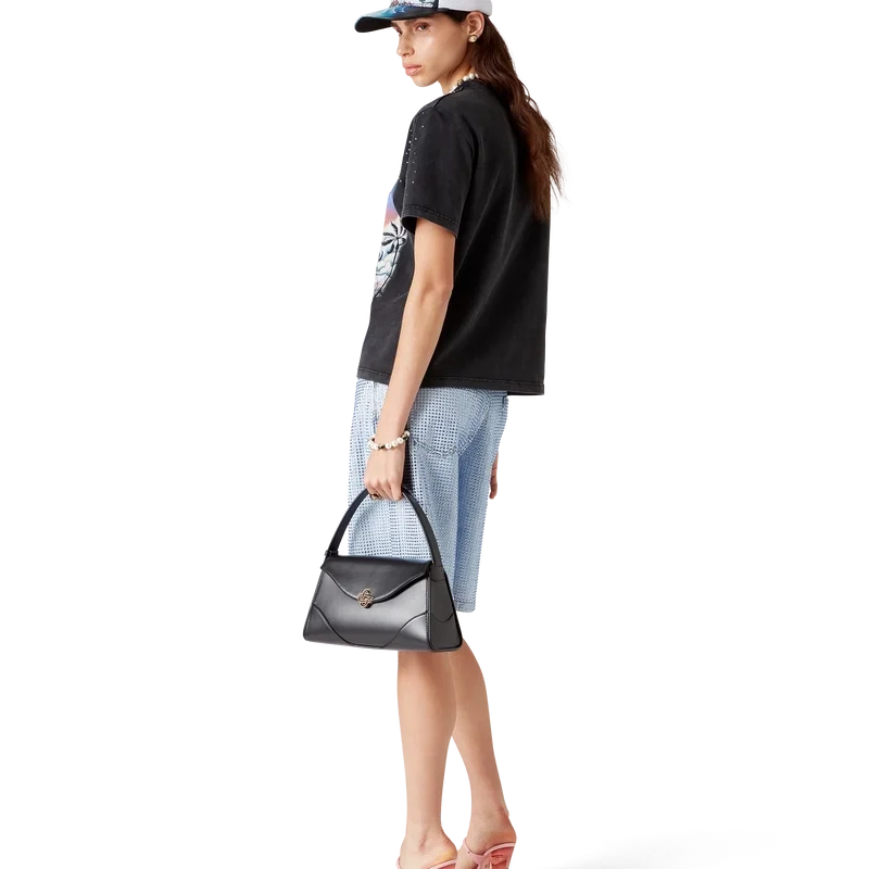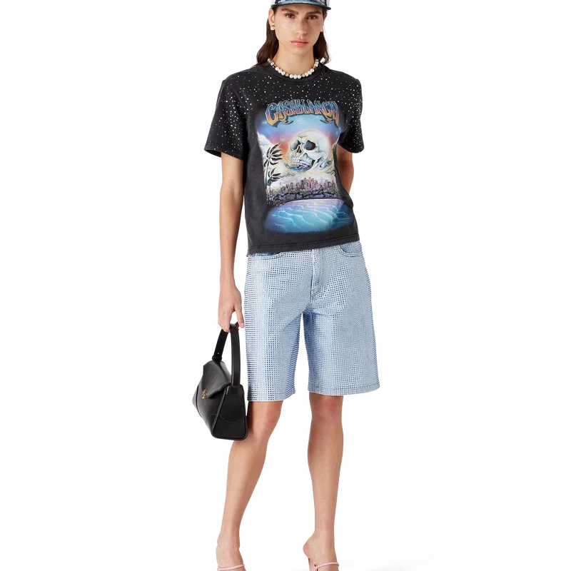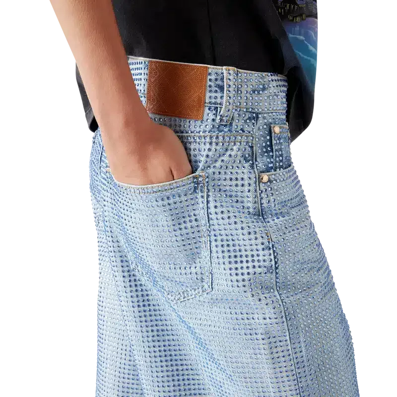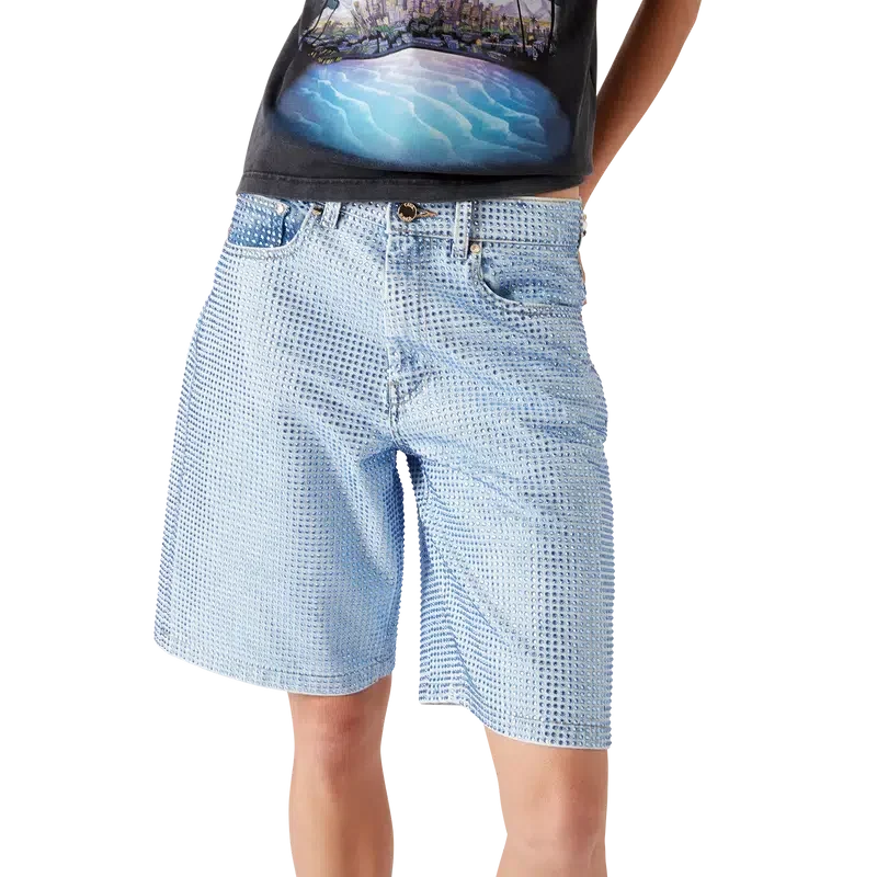 Los pantalones cortos de mezclilla con adornos de cristales tienen un diseño a la altura de la rodilla con una silueta holgada, confeccionados en tela de mezclilla y cuentas de vidrio. Cuentan con forro, bolsillos delanteros y traseros, cierre de cremallera y presillas para cinturón.