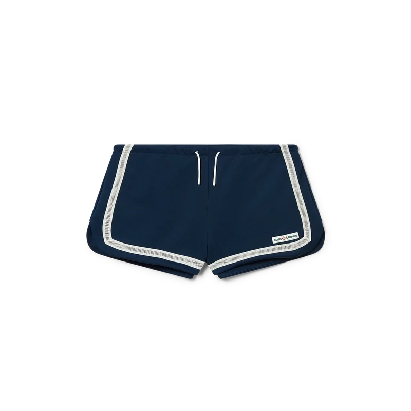 Los pantalones cortos de running con cinta de malla presentan un diseño inspirado en la ropa deportiva y están confeccionados en tejido tricot. Cuentan con cintura elástica, cierre con cordón, ribetes blancos, detalle de cinta de malla y el logotipo Casablanca característico de la casa.
