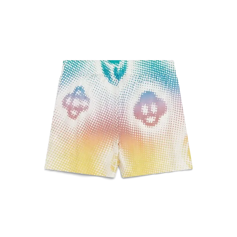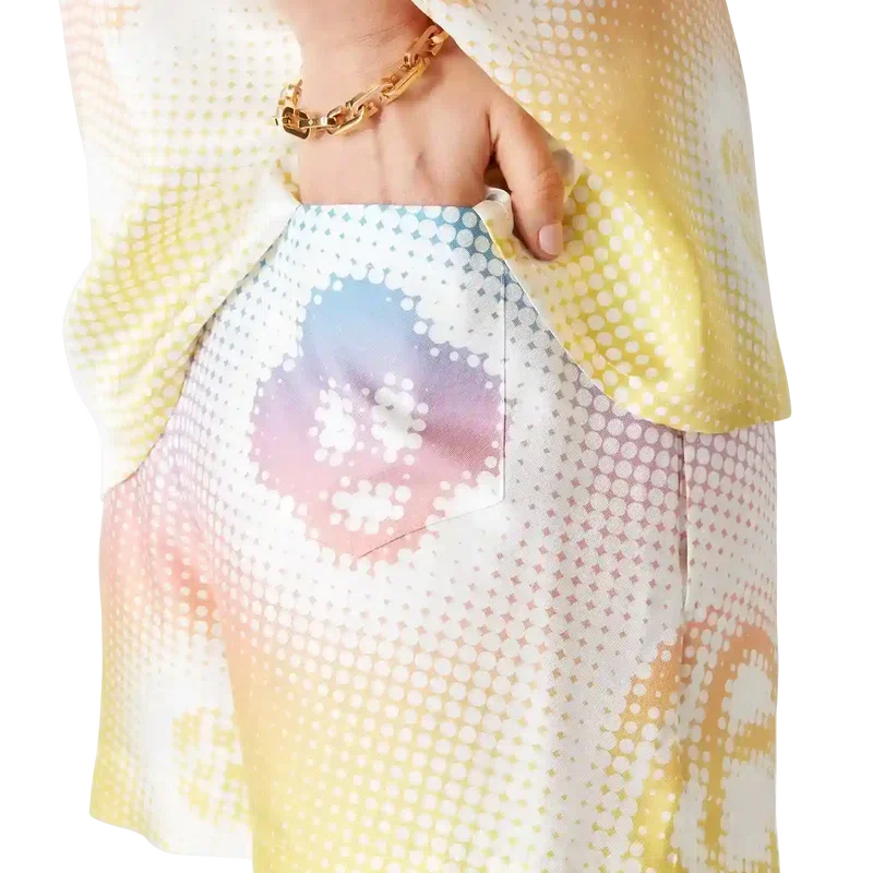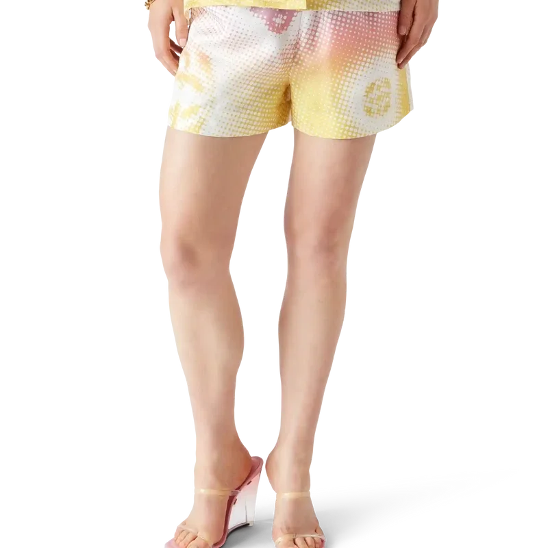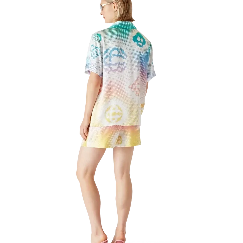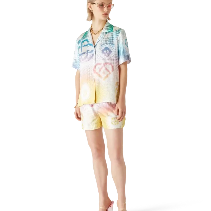 Los pantalones cortos de seda con logotipo en semitonos presentan un diseño estampado en toda la superficie con los monogramas de la casa realizados con aerógrafo, basándose en nuestros experimentos previos con esta técnica. Se completan con una cintura elástica, un bolsillo de parche trasero y bolsillos laterales en las costuras.