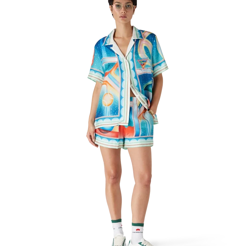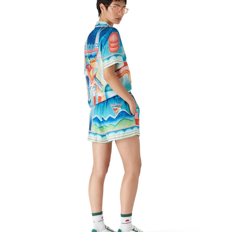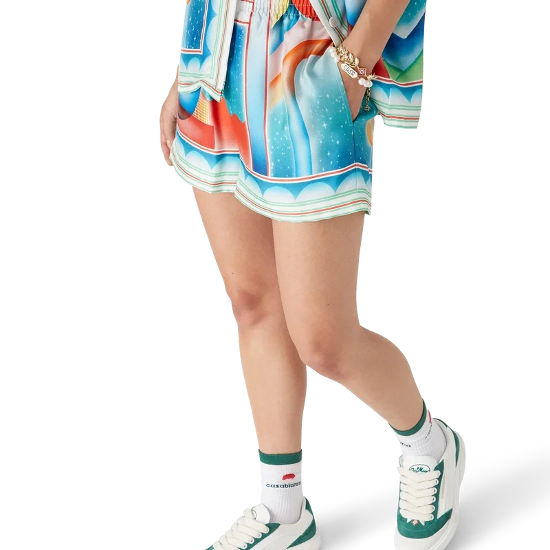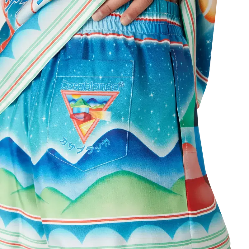 Los pantalones cortos de seda Galaxy Court presentan un diseño estampado en toda la superficie y están confeccionados en tejido de sarga de seda. Cuentan con cintura elástica, cierre con cordón, forro, bolsillos laterales en las costuras y un bolsillo trasero.
