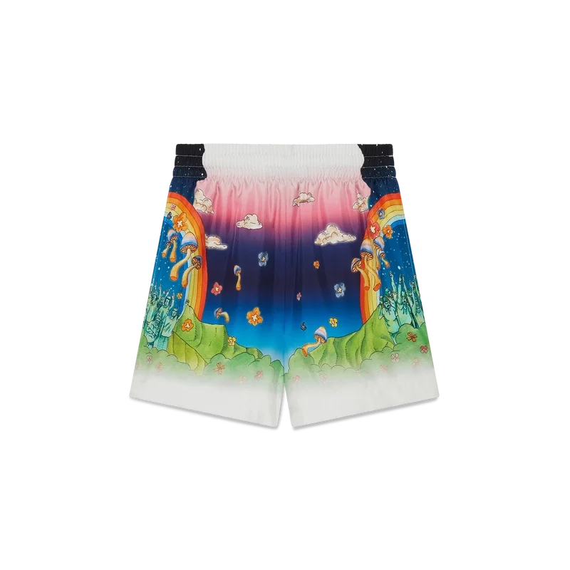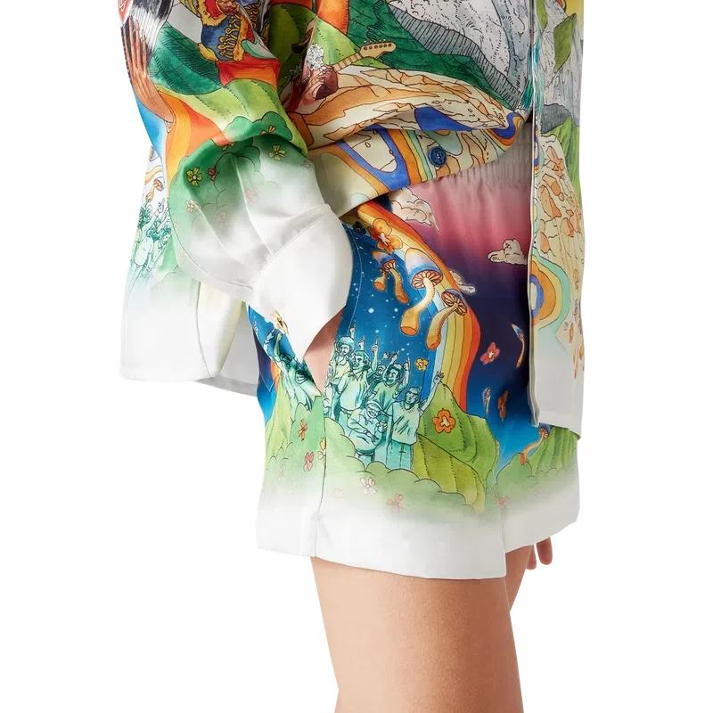 Los pantalones cortos de seda La Musique presentan un diseño estampado en toda la superficie, confeccionados en tejido de sarga de seda con el diseño de la temporada que representa una oda a Bootsy Collins y a los icónicos discos de funk de los años 70. Se completan con una cintura elástica, forro, bolsillos laterales en las costuras y un bolsillo trasero de parche.