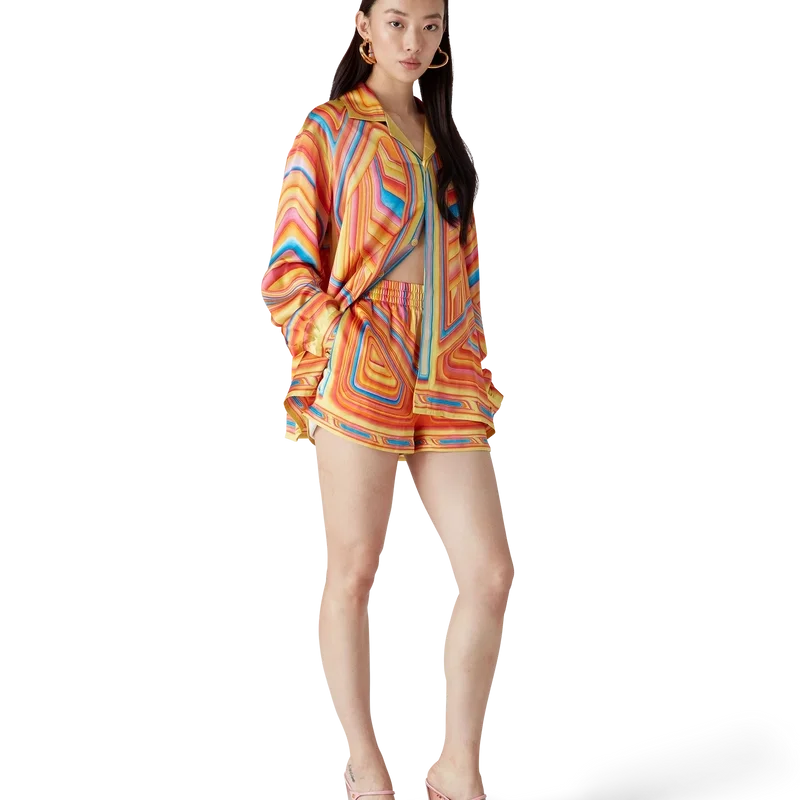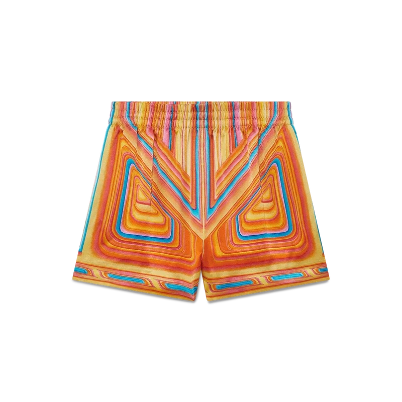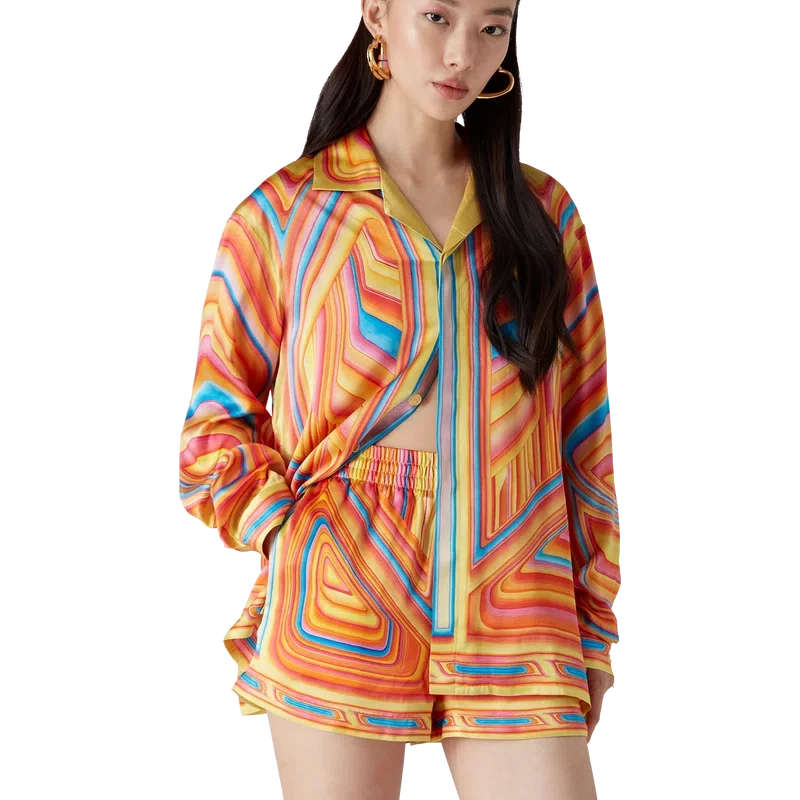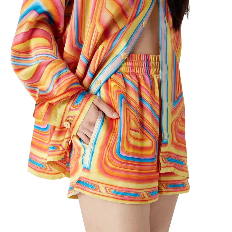 Los pantalones cortos de seda Low Rider presentan un diseño estampado en toda la prenda, confeccionados en tejido de satén de seda con el diseño de temporada de la casa, que hace referencia a los colores pop y las técnicas de pintura con aerógrafo utilizadas en los autos Low Rider, con el logotipo de Casablanca. Cuentan con cintura elástica, bolsillos laterales en las costuras, un bolsillo trasero de parche, cierre con cordón y forro.
