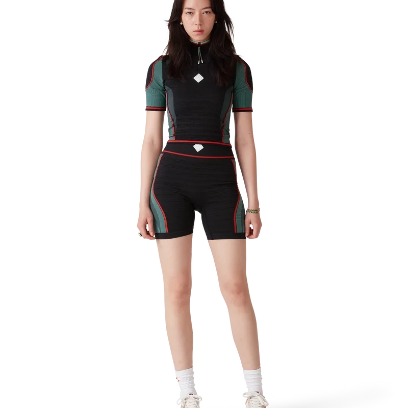 Los pantalones cortos deportivos sin costuras son un diseño de estilo deportivo corto confeccionado con un tejido elástico acanalado sin costuras. Se completan con una cintura elástica que presenta el logotipo del diamante de la casa y detalles en los paneles.