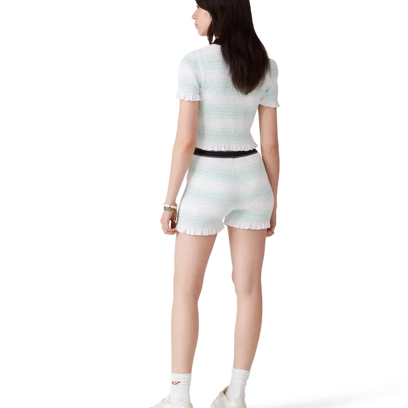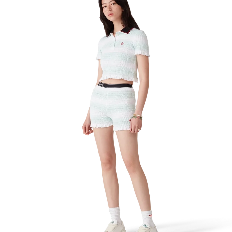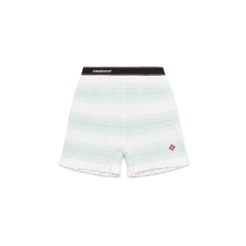 Los pantalones cortos fruncidos a rayas son un modelo corto confeccionado en tejido de algodón fruncido que luce el logotipo de diamante característico de la casa. Se completan con una cintura elástica con el logotipo de Casablanca y detalles en los bordes, y volantes en el dobladillo.