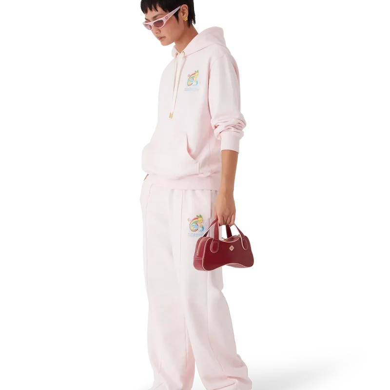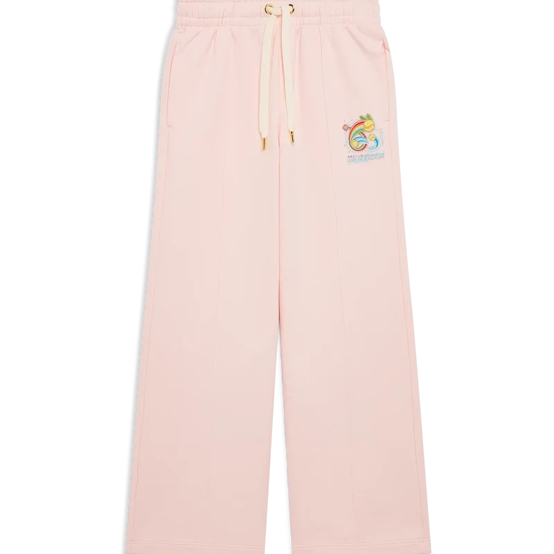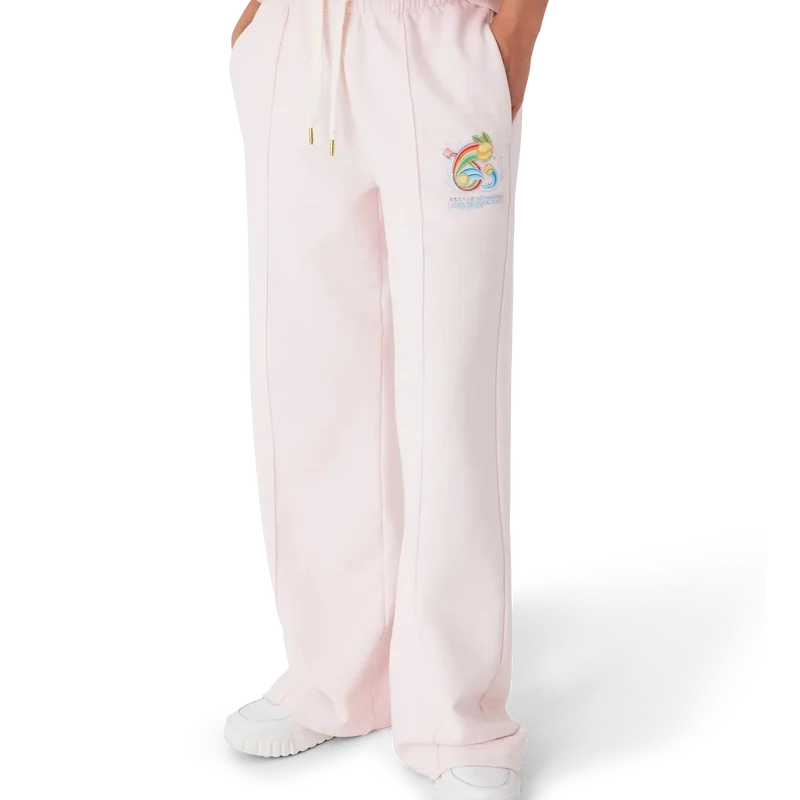 Los pantalones de chándal Manga Tennis Ball con bajo abierto son un diseño deportivo confeccionado en tejido de algodón orgánico con ilustraciones de temporada que exploran el mundo del kawaii y el manga, jugando con la iconografía de Casablanca y utilizando pelotas de tenis en lugar de naranjas para darle un toque divertido. Se completan con una cintura elástica, ojales chapados en oro, cordón de ajuste con puntas doradas, costuras plisadas en la parte delantera, bolsillos en las costuras y un bolsillo de parche en la parte trasera.