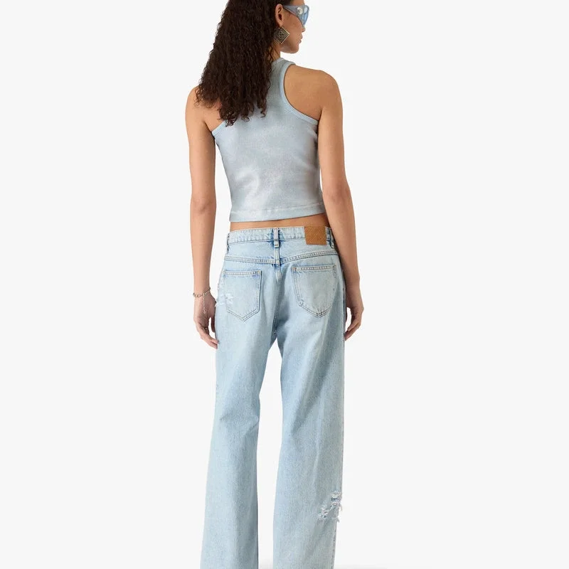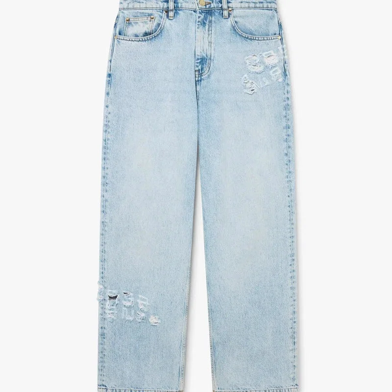 Los jeans de mezclilla con grafitis de lavado claro tienen un diseño de pierna recta y presentan el logotipo Casablanca de la casa en un texto estilo grafiti grabado en la tela. Se completan con herrajes chapados en oro, presillas para el cinturón, bolsillos delanteros y traseros, un parche de cuero con la marca y cierre de cremallera.