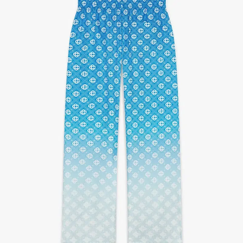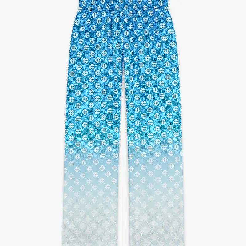 Los pantalones de seda con Diamond Monogram en degradado azul tienen corte recto y un diseño estampado en toda la prenda con el motivo Art of the Silks de la temporada: el Diamond Monogram en degradado. Cuentan con cintura elástica, cierre con cordón, bolsillos laterales en las costuras y una silueta holgada. Diseñados para combinarse con la camisa corta de seda con monograma degradado a juego