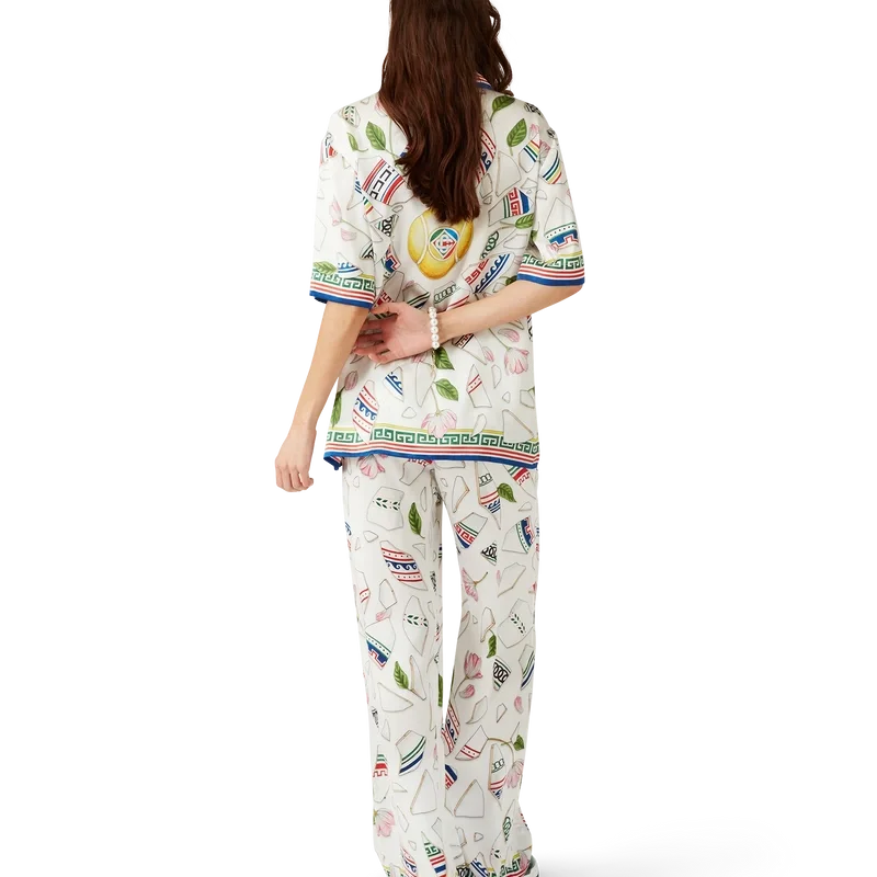 Los pantalones de seda Le Vase Brise presentan un diseño estampado en toda la superficie, confeccionados en tejido de satén de seda con el estampado de temporada de la casa, inspirado en el estudio continuo de la belleza clásica y el encanto contemporáneo de la Antigua Grecia. Se completan con una cintura elástica, bolsillos laterales en las costuras, un bolsillo de parche trasero, cierre con cordón y detalles inspirados en la clave griega en el dobladillo.