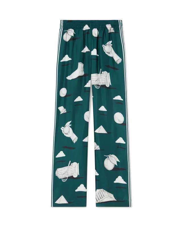 Los pantalones de seda Metaphysical presentan un diseño estampado en toda la superficie confeccionado en tejido de sarga de seda, con ilustraciones que representan los elementos de diseño fundamentales de la casa. Se completan con una cintura elástica con cierre de cordón, bolsillos laterales en las costuras y detalles de rayas a lo largo de los costados.