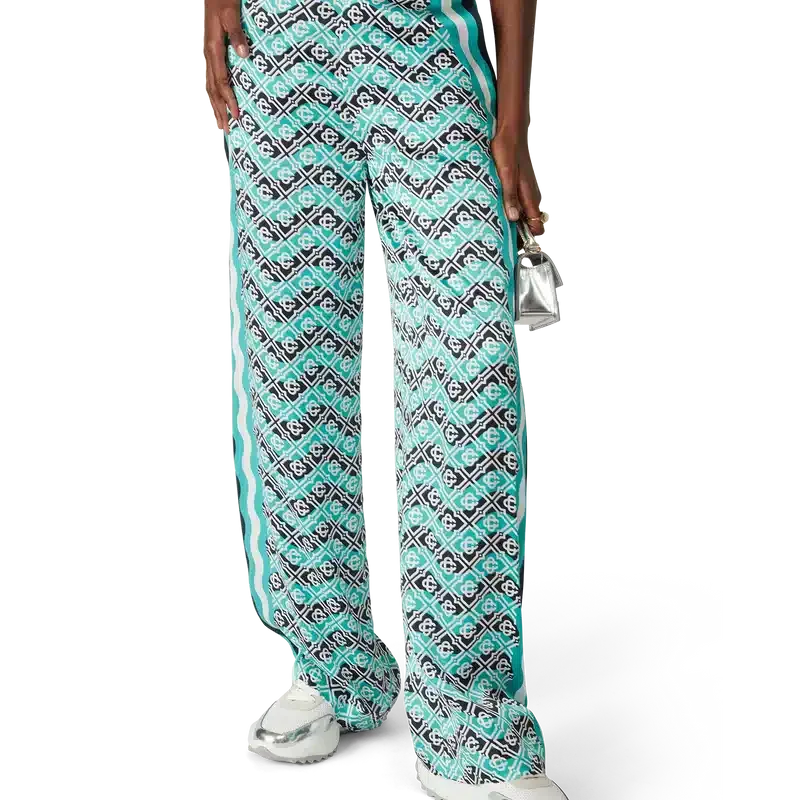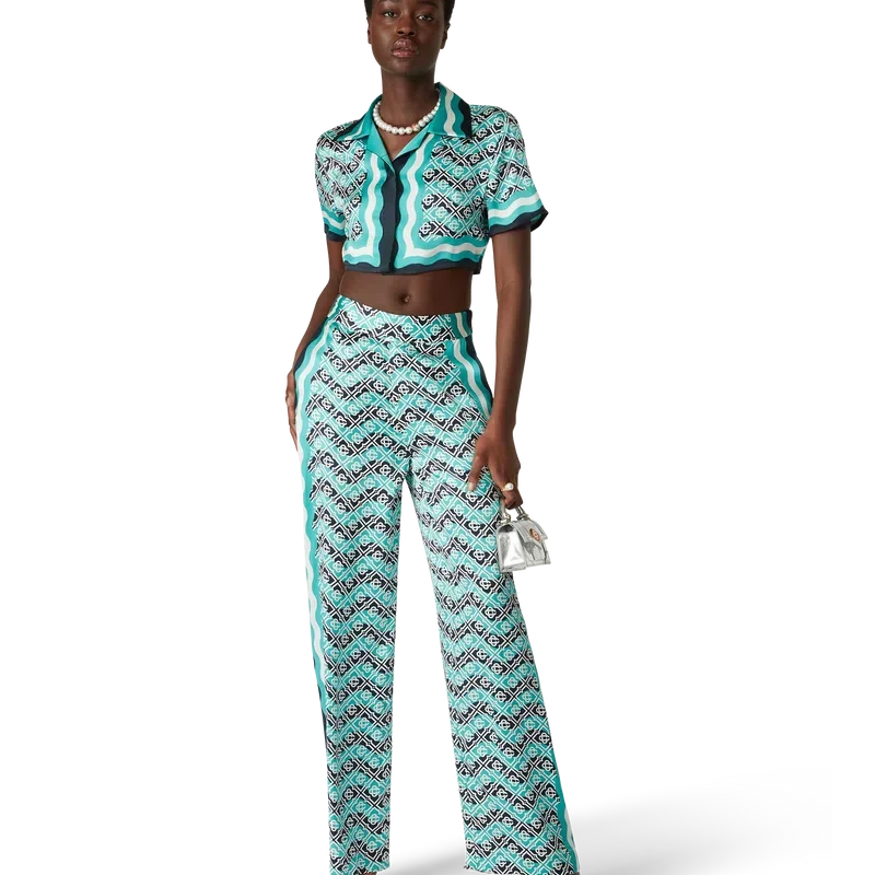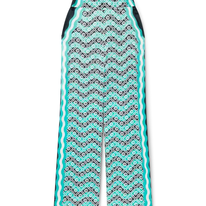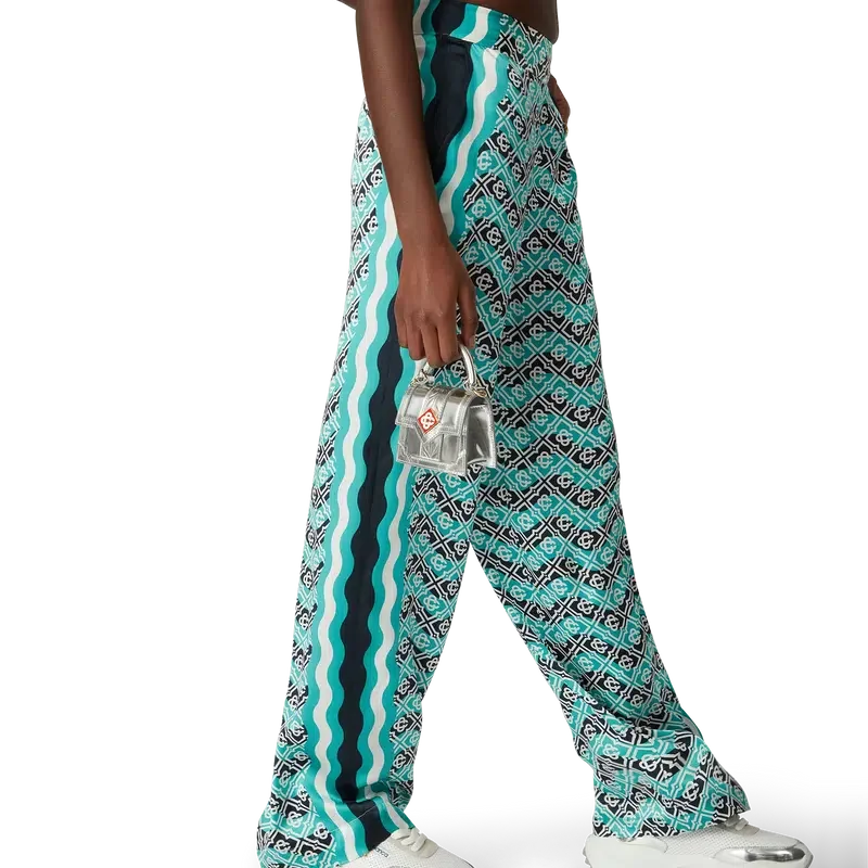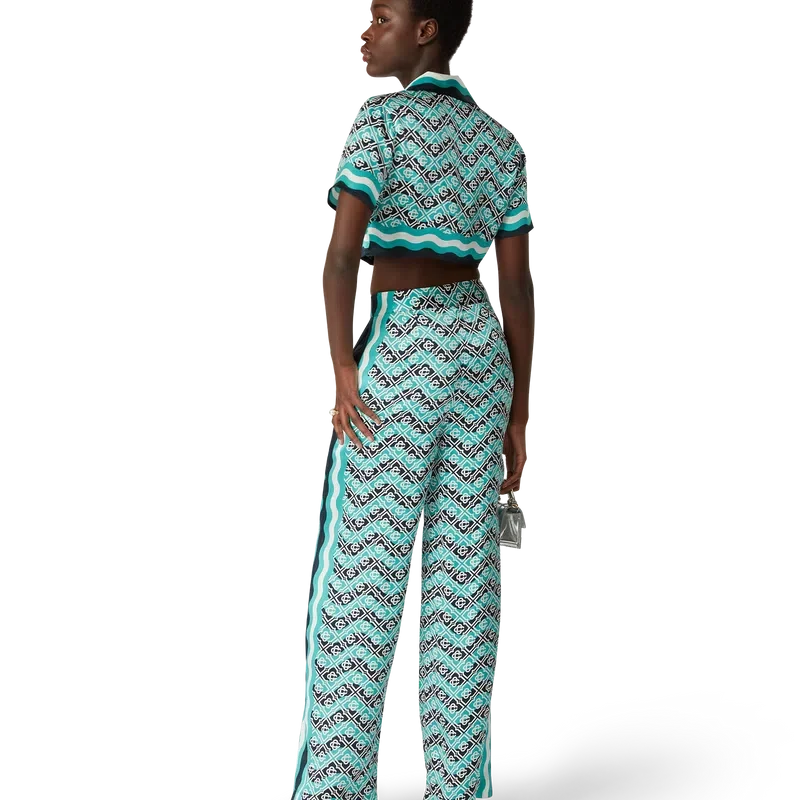 Los pantalones de seda Monogram Wave presentan un estampado integral con el emblemático motivo Monogram de la casa, confeccionados en tejido de satén de seda. Se completan con detalles de rayas horizontales inspiradas en el estilo Memphis Wave, rayas verticales a lo largo de los laterales y bolsillos laterales en diagonal.