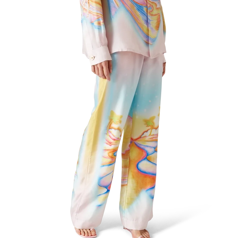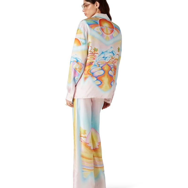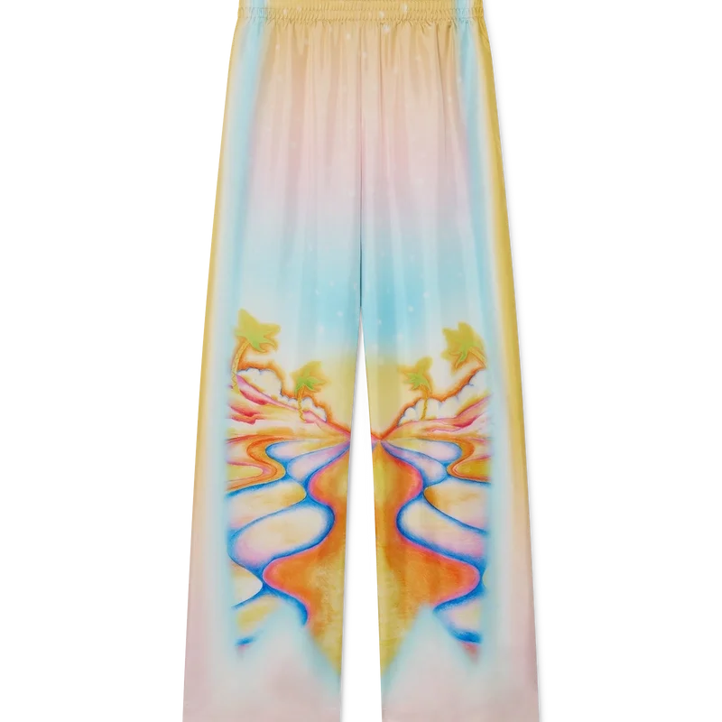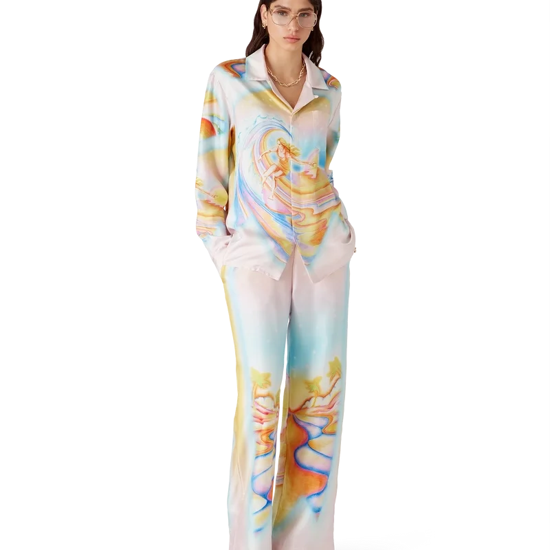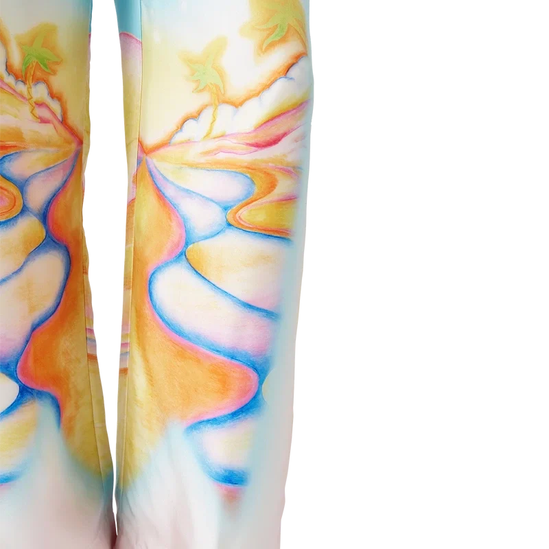 Los pantalones de seda psicodélicos Nirvana presentan un diseño estampado en toda la superficie, confeccionados en tejido de sarga de seda con ilustraciones inspiradas en las tablas de surf aerografiadas de la California de los años 70, utilizando colores pastel que le dan al estampado una sensación casi onírica e idealista. Acabados con cintura elástica, cierre con cordón, bolsillos laterales en las costuras y un bolsillo trasero de parche.