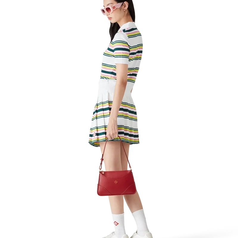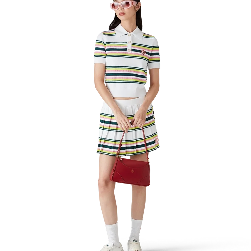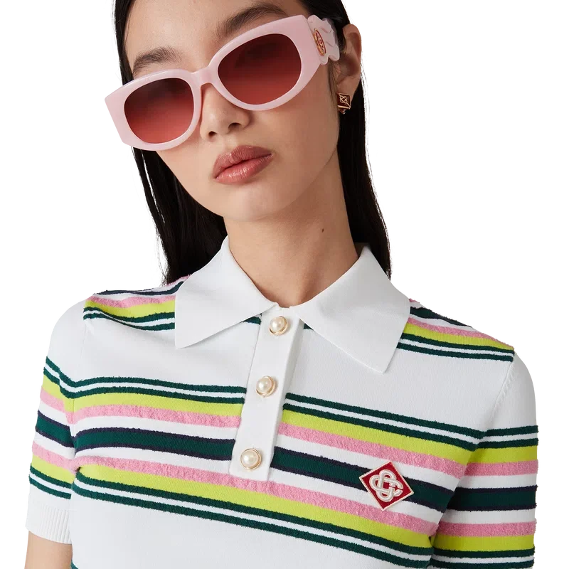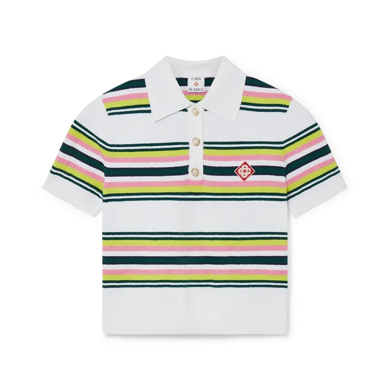 La camisa a rayas es un diseño de manga corta confeccionado en tejido de punto a rayas con el logotipo de diamante característico de la casa. Se completa con botones de perla con borde dorado característicos, tapeta de tres botones y puños, dobladillo, cuello y tapeta acanalados.