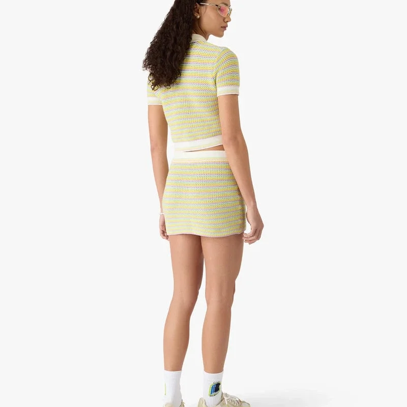 El polo a rayas Bourgeois es un diseño de punto refinado que destaca por sus elegantes detalles de rayas horizontales. Se completa con cierre de botones, cuello acanalado en contraste, tapeta, puños y dobladillo, botones esmaltados con ribete plateado y el logotipo de la casa en relieve y bañado en plata, con una silueta entallada que encarna el enfoque sofisticado de la casa en cuanto a prendas de Punto.