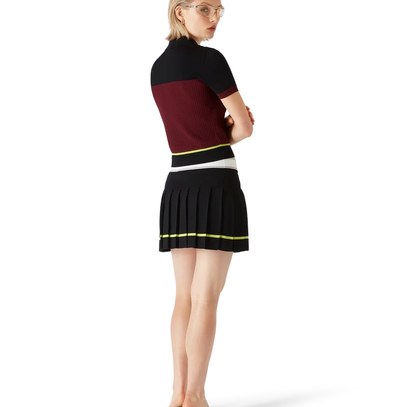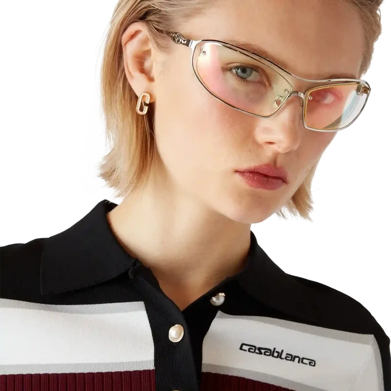 El polo de manga corta a rayas presenta un diseño refinado con una confección de punto clásica; su silueta encarna una elegancia discreta con un corte ajustado. Se completa con un cuello acanalado, tapeta de botones y los característicos botones de perla con borde dorado.