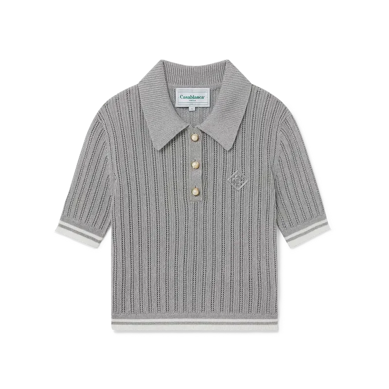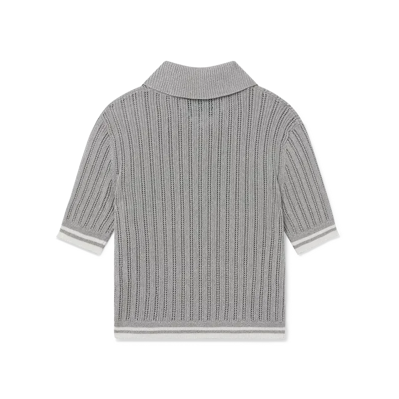 El polo de manga corta plateado es un modelo corto confeccionado en tejido de punto de mezcla de poliéster metalizado, con el logotipo del diamante de la casa en un diseño de poliuretano transparente. Se completa con los botones de perla con borde dorado característicos de la casa, detalles de rayas en los puños y el dobladillo, y cuello, puños, dobladillo y tapeta acanalados.