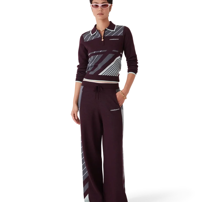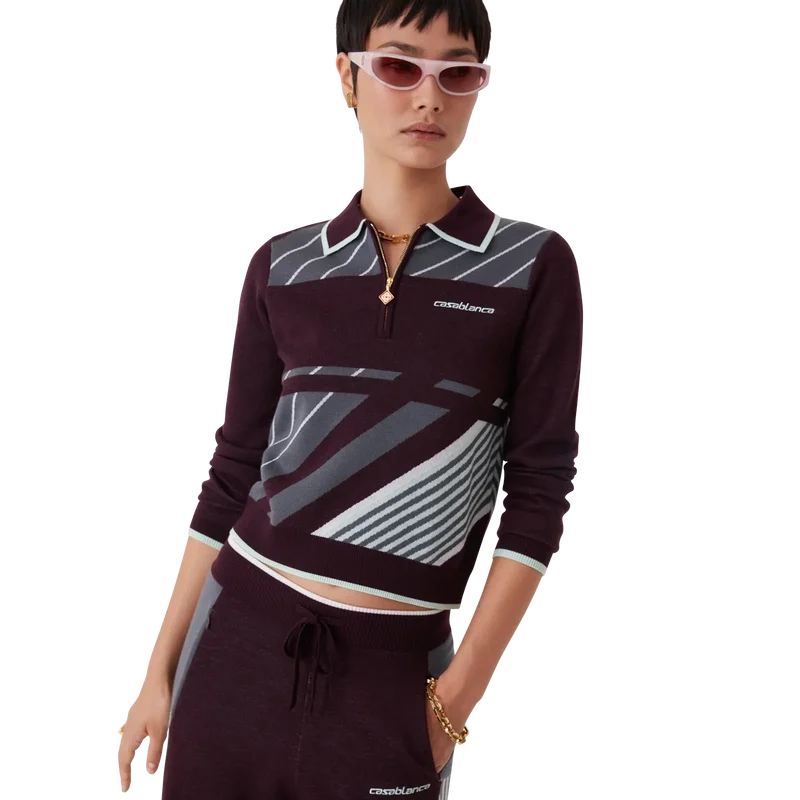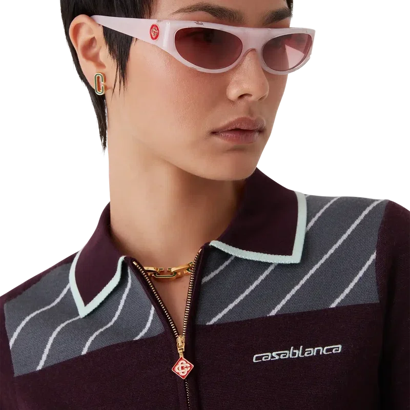 El polo de manga larga Diagonal Tennis Merino es un diseño de punto con rayas deportivas diagonales y el logotipo de Casablanca bordado. Se completa con un cierre de cremallera de un cuarto de longitud con la lengüeta de cremallera con el logotipo del diamante característico, cuello acanalado y detalles de bordes en contraste en el cuello y los puños.