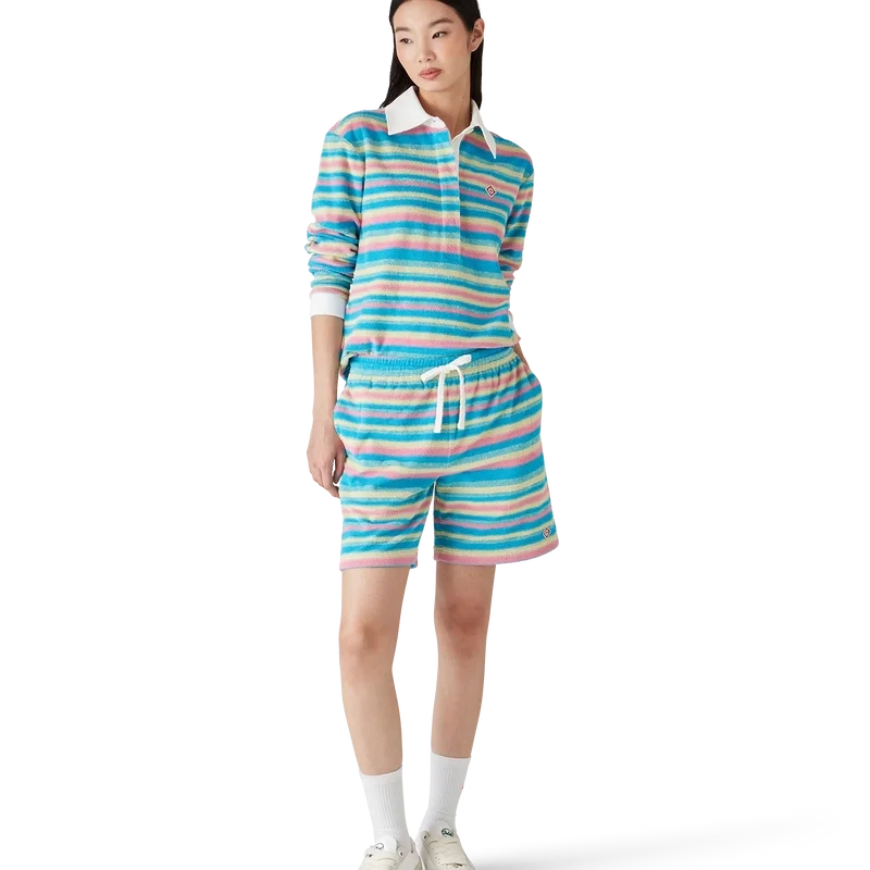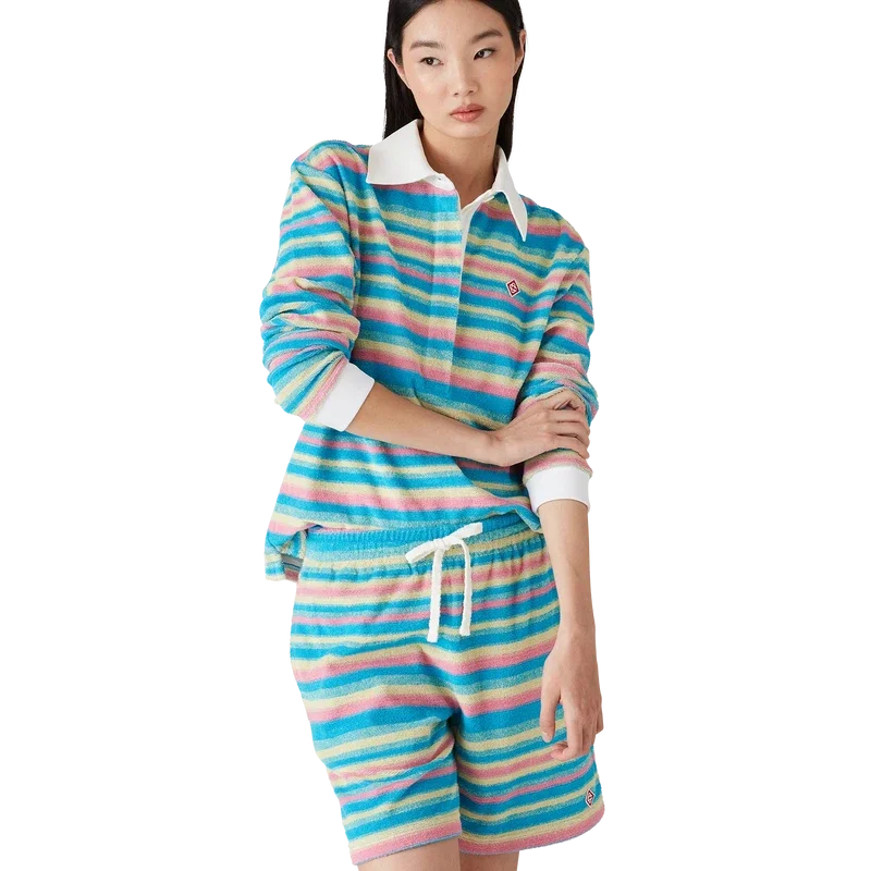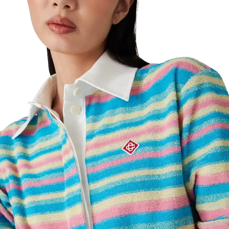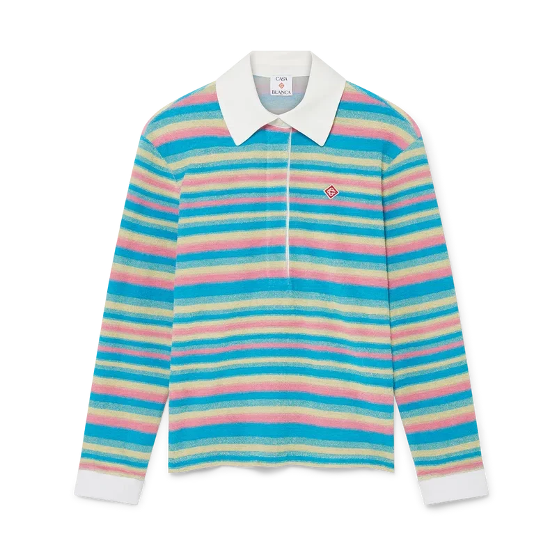 El polo de rizo a rayas es un diseño de manga larga confeccionado en tejido de rizo y presenta el logotipo de diamante característico de la casa. Se completa con un cuello en V en contraste y puños acanalados, cierre con botones y una tapeta de seis botones con botones de corozo con el logotipo CC entrelazado.