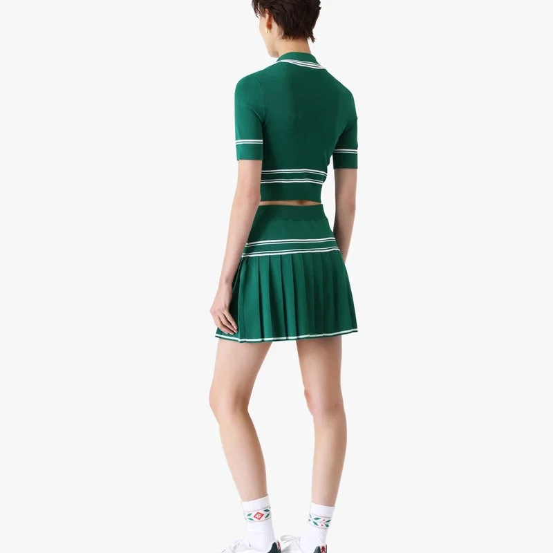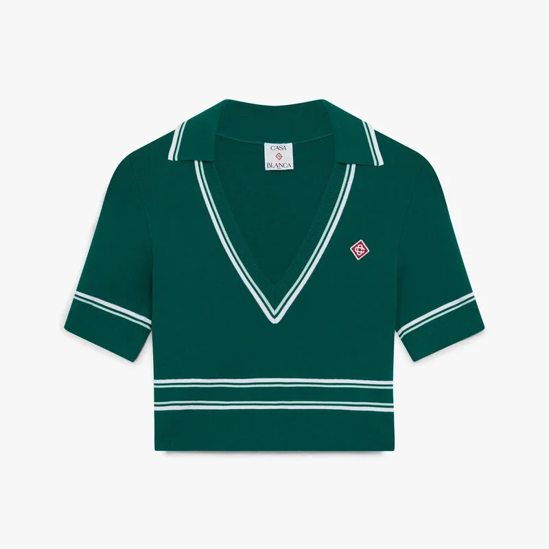 El polo corto de punto verde presenta un diseño refinado con el logotipo de diamante característico de la casa. Cuenta con cuello, puños y dobladillo acanalados con detalles de rayas blancas en contraste, un escote en V profundo y una silueta ajustada.