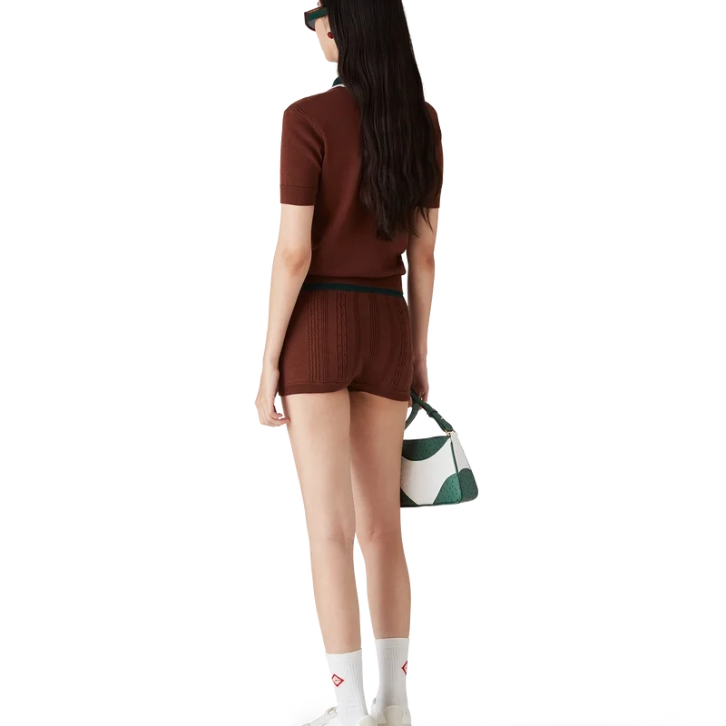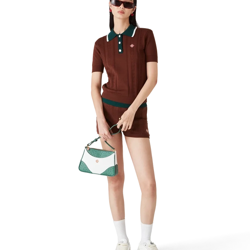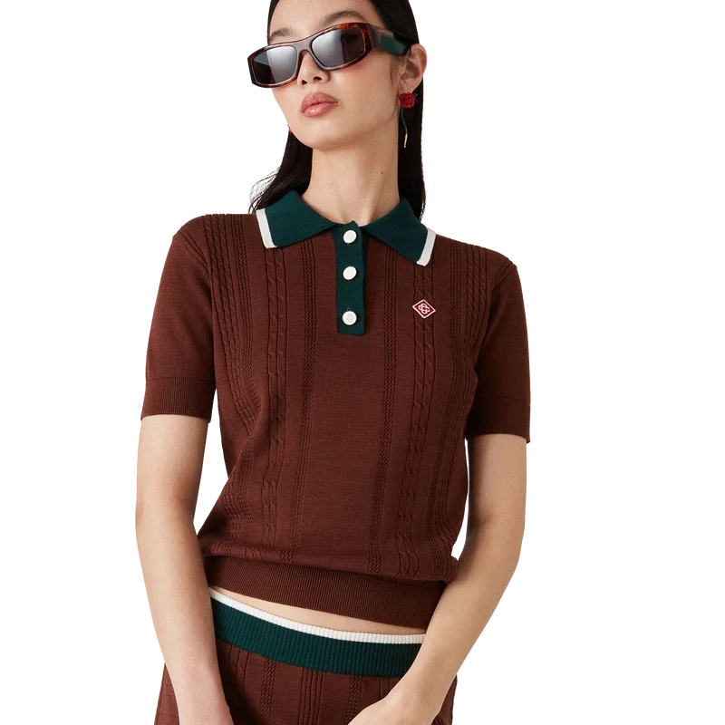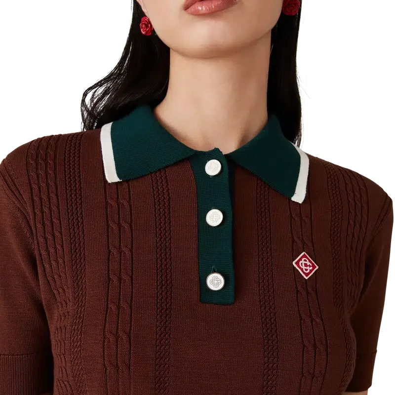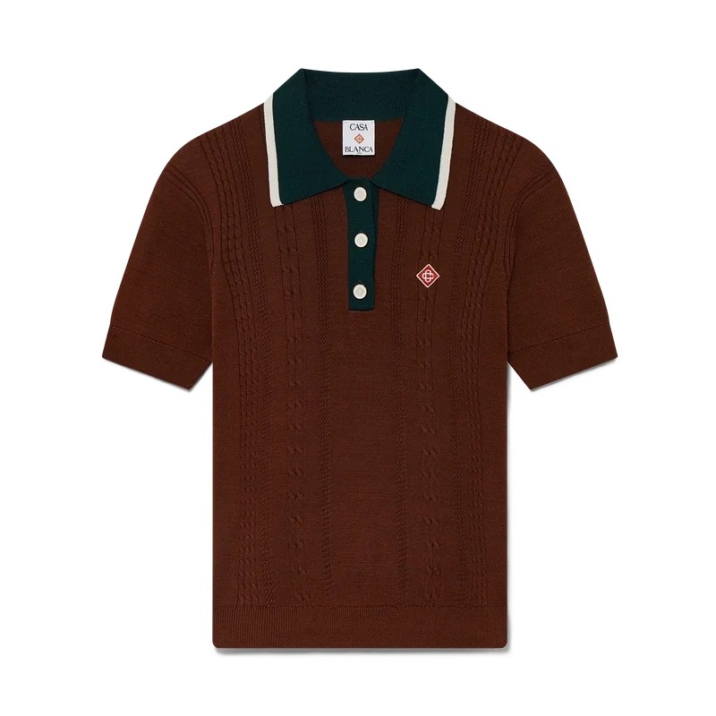 La camisa de punto trenzado es un diseño de manga corta confeccionado en tejido de algodón de punto que luce el logotipo de diamante característico de la casa. Se completa con botones planos con el logotipo de CC, una tapeta de tres botones, una tapeta y un cuello acanalados en contraste, con detalle de borde blanco en el cuello. Diseñado para llevarse con los pantalones cortos de punto trenzado a juego.