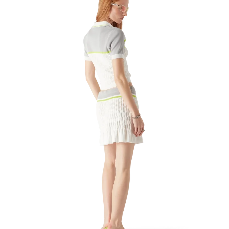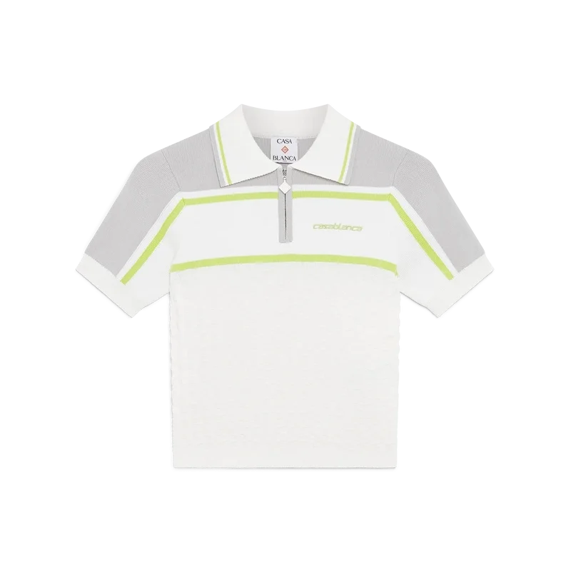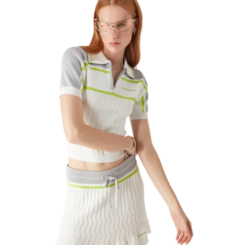 El polo de tenis es un diseño de punto con hombros y mangas exteriores en contraste. Se completa con un cierre de cremallera, un cuello con detalle de borde a rayas, el logotipo característico de Casablanca y detalles acanalados en los puños y el dobladillo.