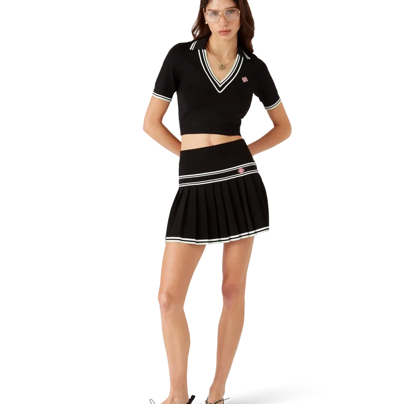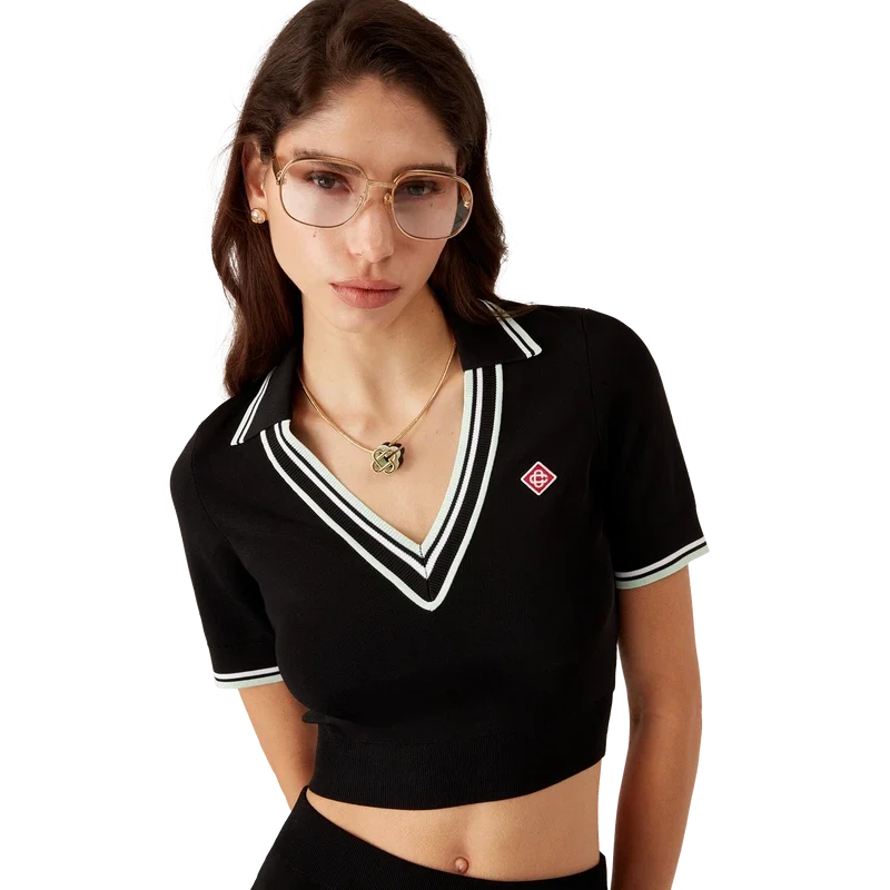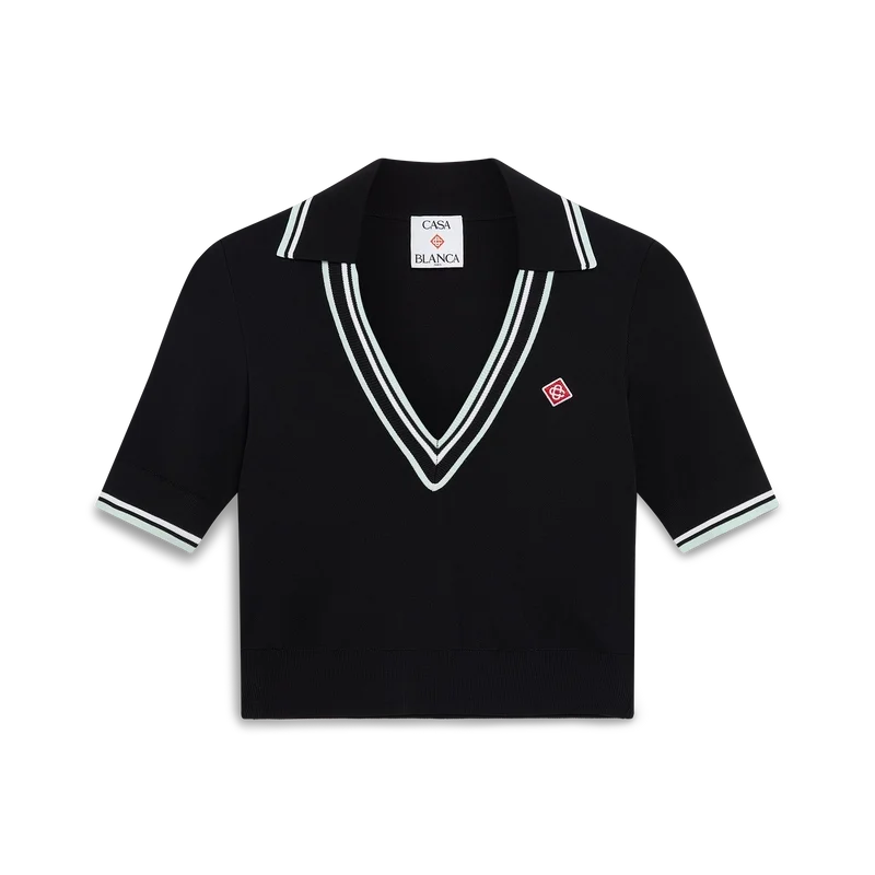 El polo de viscosa con cuello en V es un modelo corto confeccionado en tejido de punto y decorado con el emblemático logotipo de rombos de la marca. Se completa con cuello, puños y dobladillo acanalados con detalles de rayas verdes y blancas en contraste, y un profundo cuello en V.