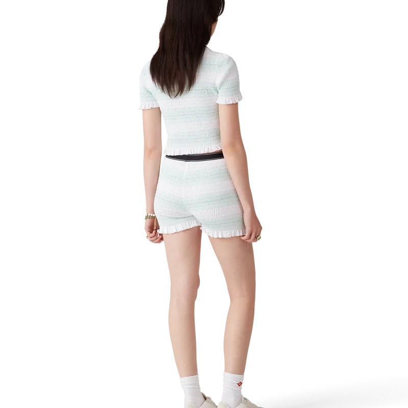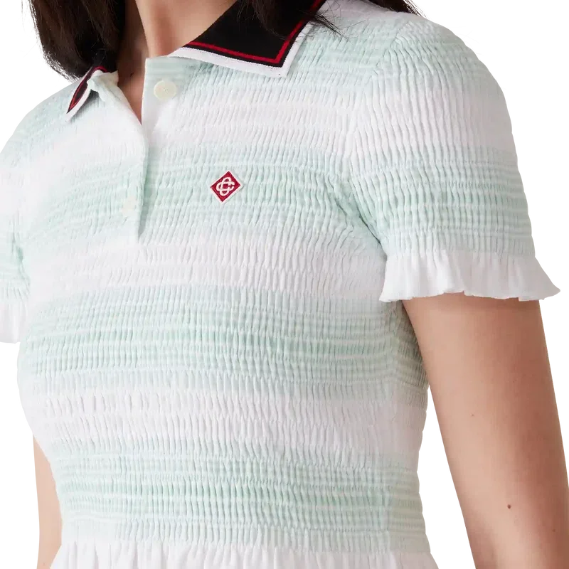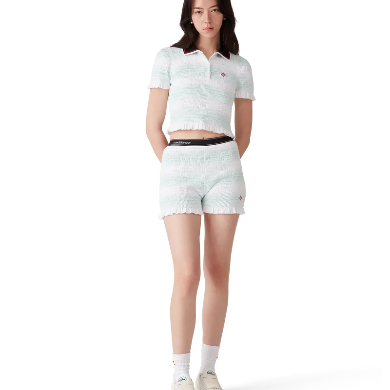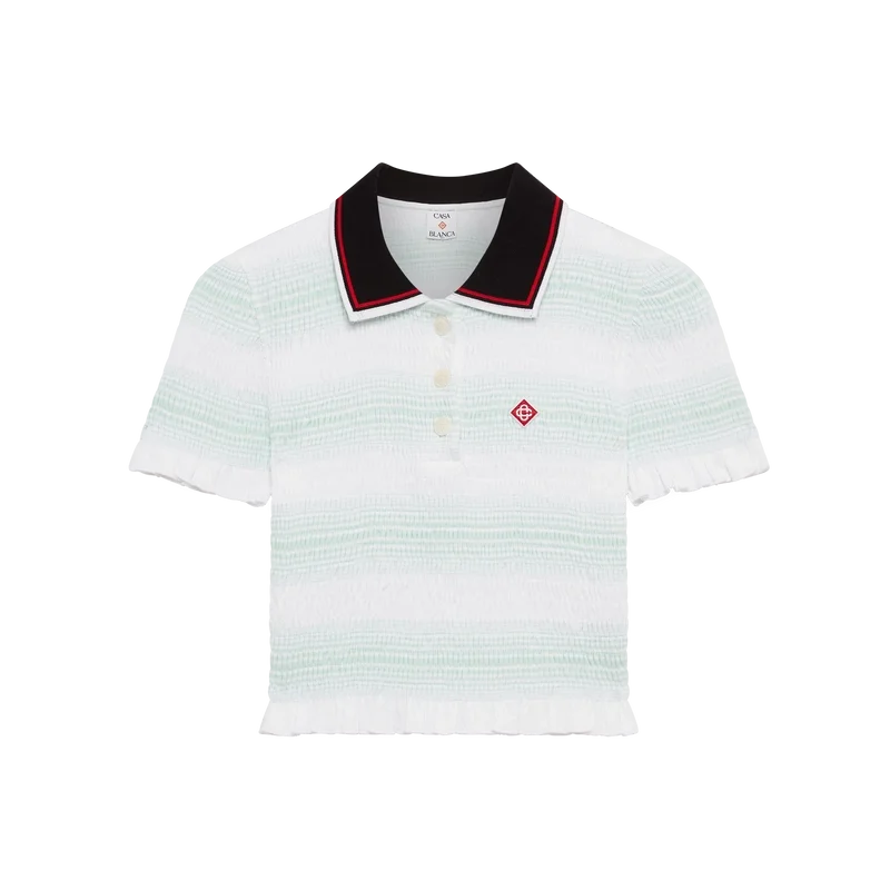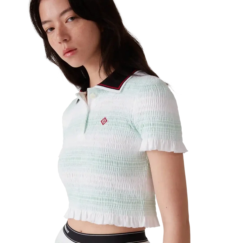 El polo fruncido a rayas es un modelo corto que luce el logotipo de diamante característico de la casa. Confeccionado en tejido de algodón fruncido y rematado con cuello acanalado con detalle de borde a rayas, cierre de tapeta de tres botones, mangas cortas y detalles de volantes en los puños y el dobladillo. Diseñado para quedar por encima del ombligo.