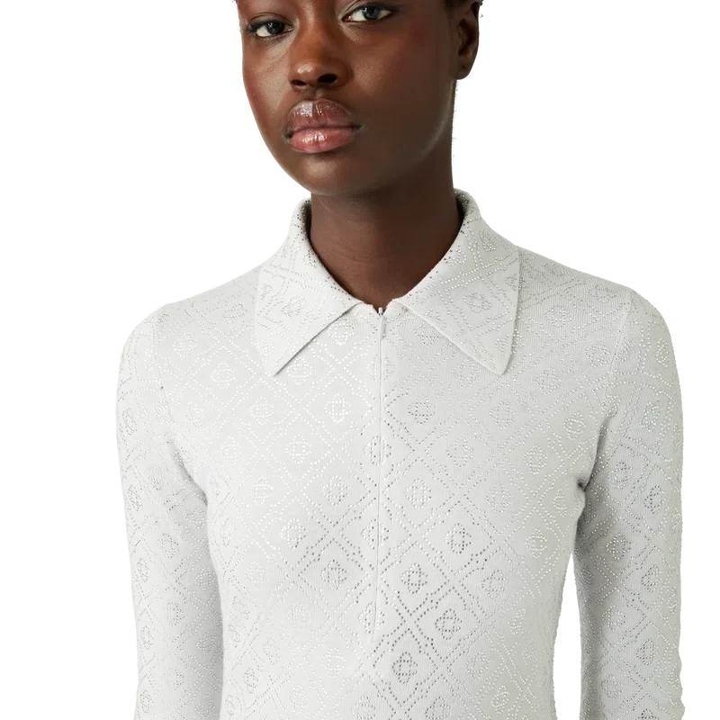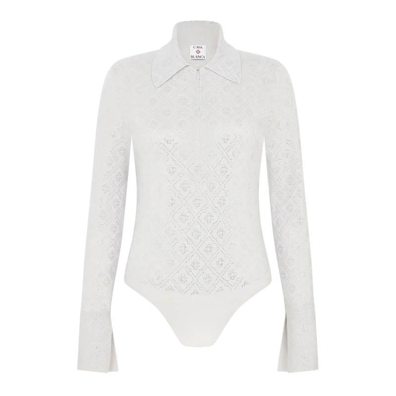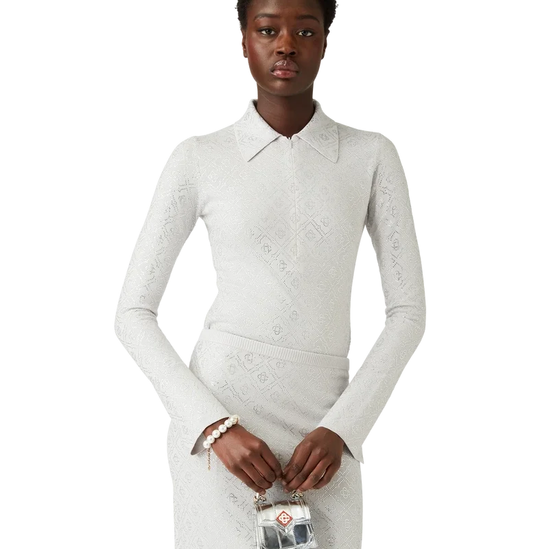 El body de punto con monograma de cristal es un diseño de una sola pieza, ajustado y de manga larga, confeccionado en tejido de lana merino y decorado con el monograma de cristal de la casa. Se completa con puños acampanados con abertura, cierre de cremallera con media tapeta, cuello en pico, corte alto en las piernas y cierre de botones a presión.