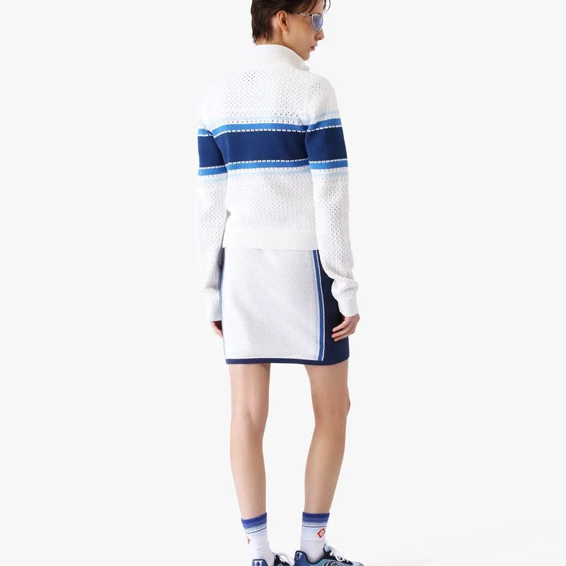 La chaqueta bomber de malla a rayas blancas y azules presenta un diseño de punto refinado, con una raya azul que recorre el pecho y la espalda. Se completa con el logotipo de diamante característico de la casa, un cuello acanalado clásico con detalle de borde a rayas, cierre de cremallera, puños y dobladillo elásticos, y una silueta relajada que encarna el enfoque sofisticado de la casa hacia el estilo deportivo-casual.