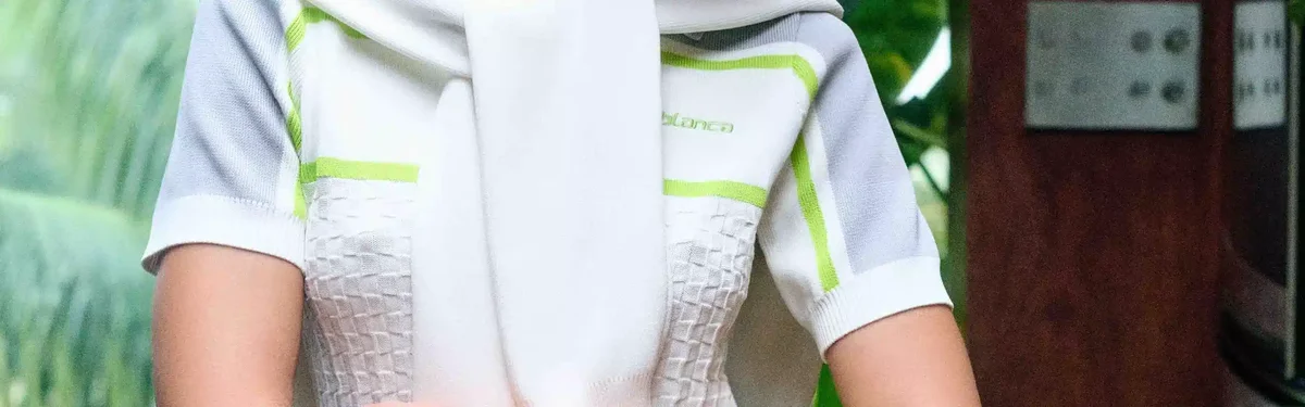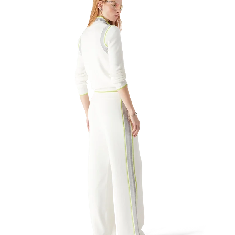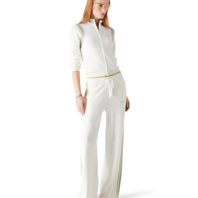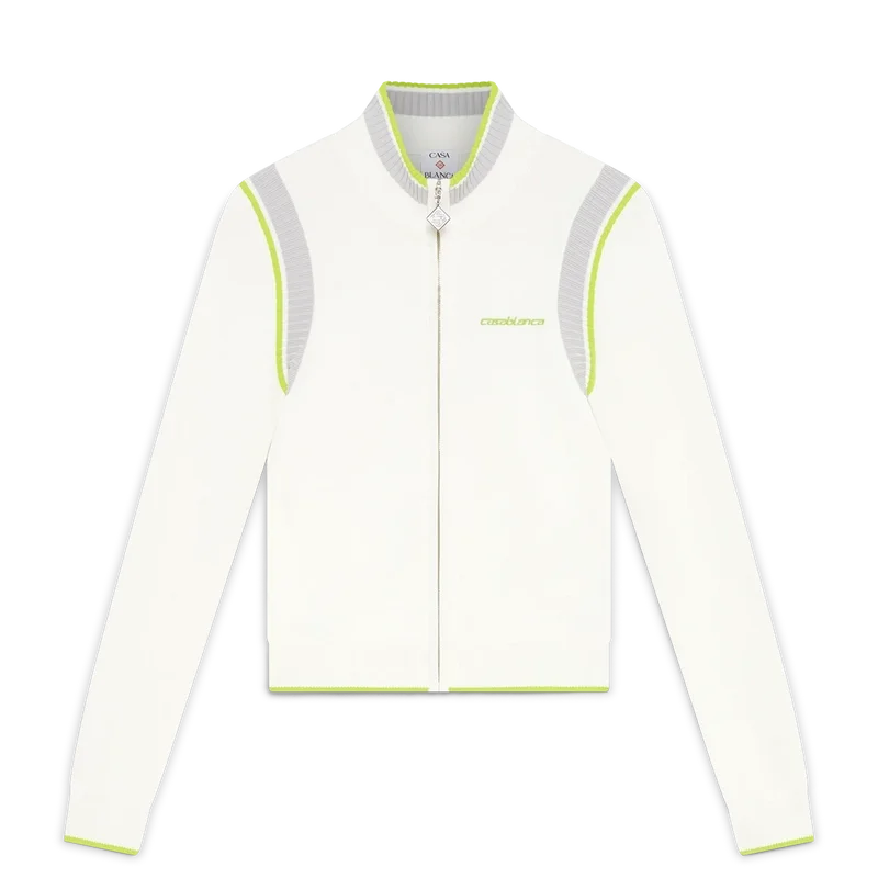 La chaqueta de tenis de manga larga con cuello es un diseño inspirado en la ropa deportiva que presenta el logotipo de Casablanca en verde. Se completa con un cierre de cremallera con la lengüeta en forma de diamante característica de la casa, cuello alto de punto, puños, dobladillo y detalles en las sisas, y una silueta holgada.