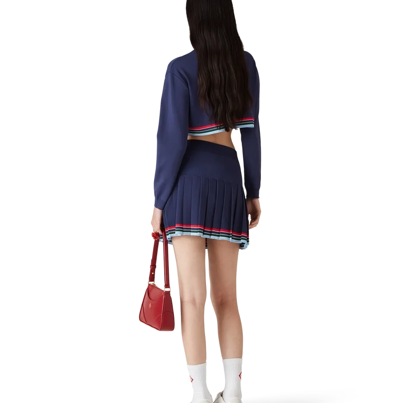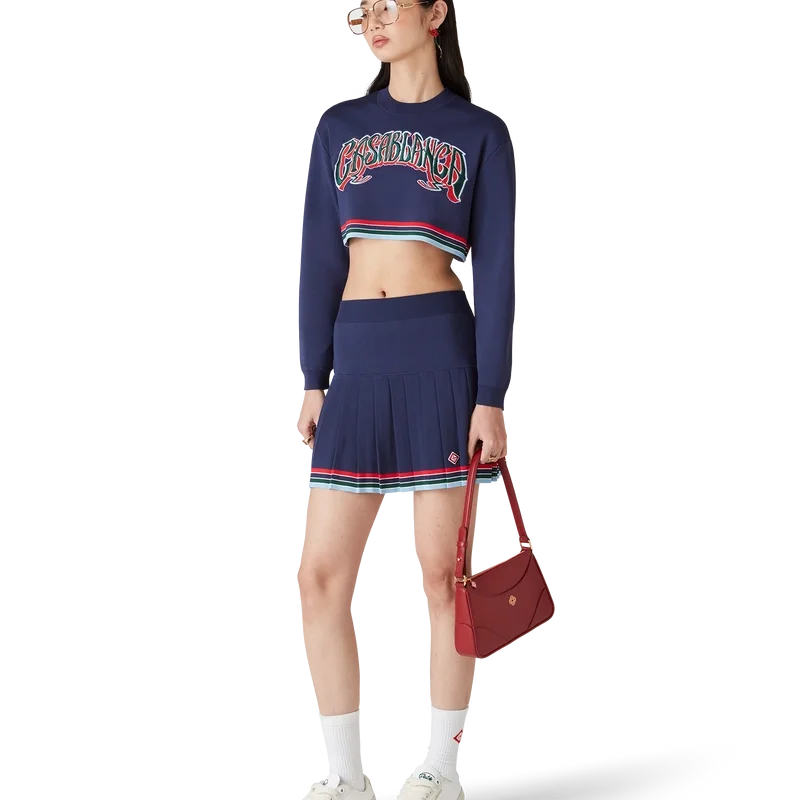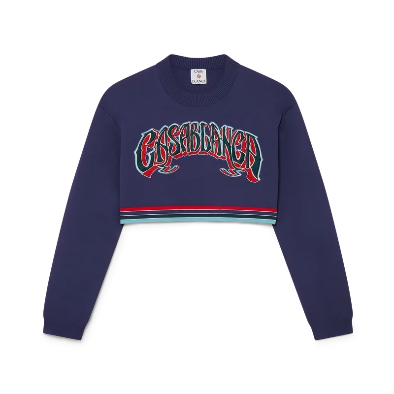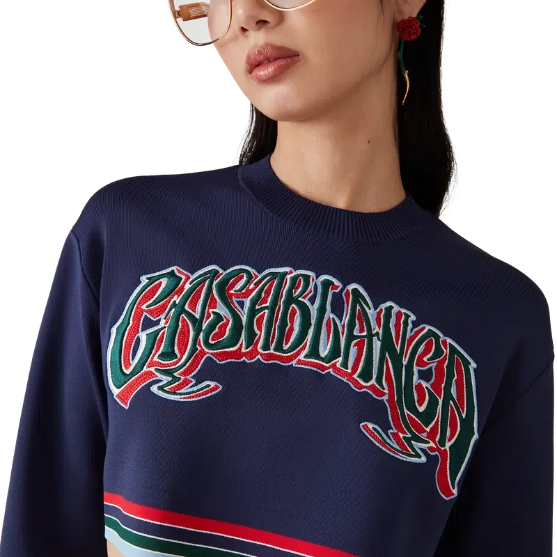 El suéter corto estilo béisbol está confeccionado en tejido tricot y presenta el logotipo de Casablanca bordado con tipografía dibujada a mano, inspirada en la tipografía gótica utilizada en los tatuajes. Se completa con cuello y puños acanalados, y un detalle de rayas horizontales en rojo, blanco, azul, verde y azul marino en el dobladillo.