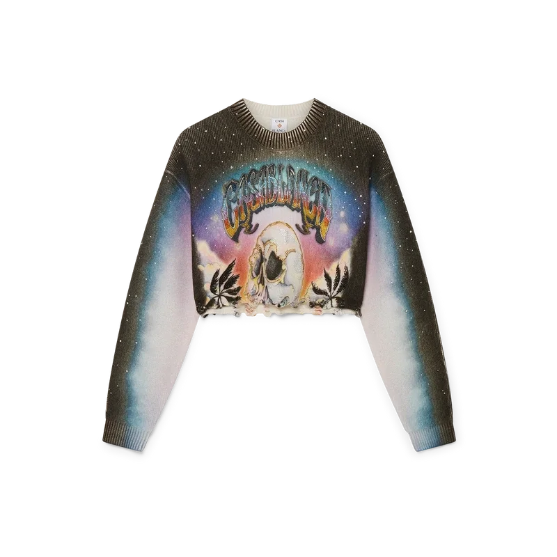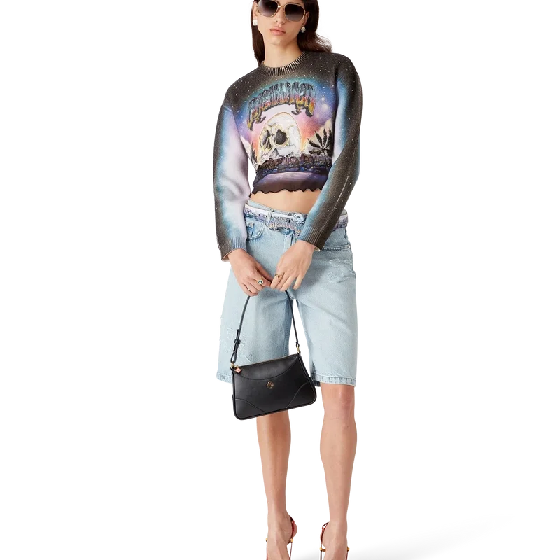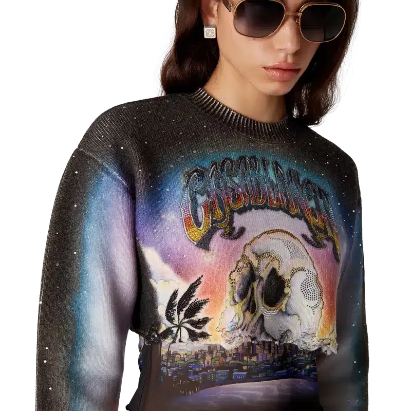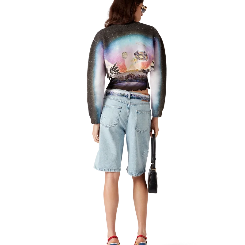 El suéter corto de mezcla de cachemira de La Pramonition es un modelo de pantalones cortos de manga larga confeccionado con un tejido de lana estampado que presenta el diseño de la temporada, inspirado en una visión inquietante del horizonte de Los Ángeles por la noche, con elementos de ovnis que tocan la inspiración de la ciencia ficción vintage. Se completa con un cuello redondo clásico acanalado y puños acanalados.