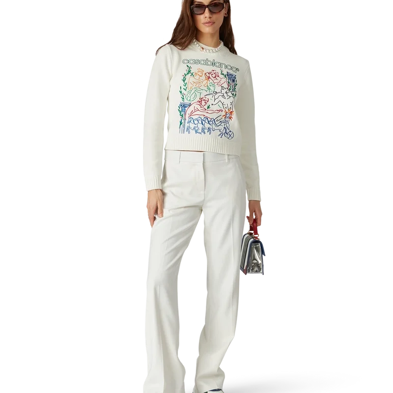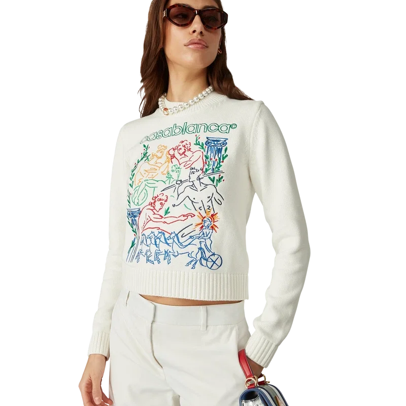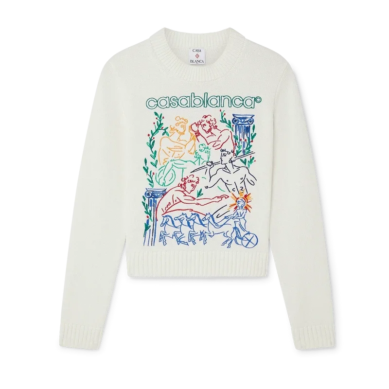 El suéter bordado es un diseño de manga larga confeccionado en tejido de algodón de punto con el diseño bordado de temporada de la casa. Se completa con un clásico cuello redondo y puños, cuello y dobladillo acanalados.