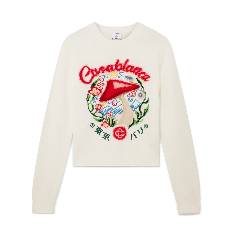 El suéter de algodón bordado con setas es un diseño de manga larga que presenta uno de los elementos de diseño característicos de la casa —la seta— confeccionado en tejido de algodón. Se completa con un cuello redondo clásico y puños y dobladillo acanalados.
