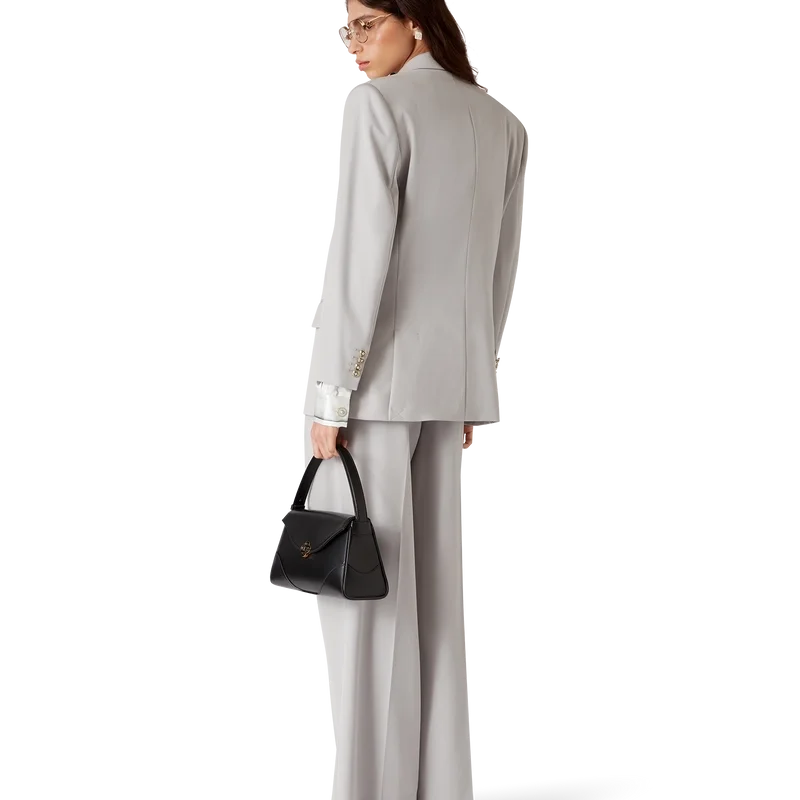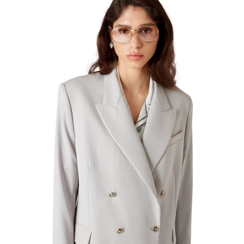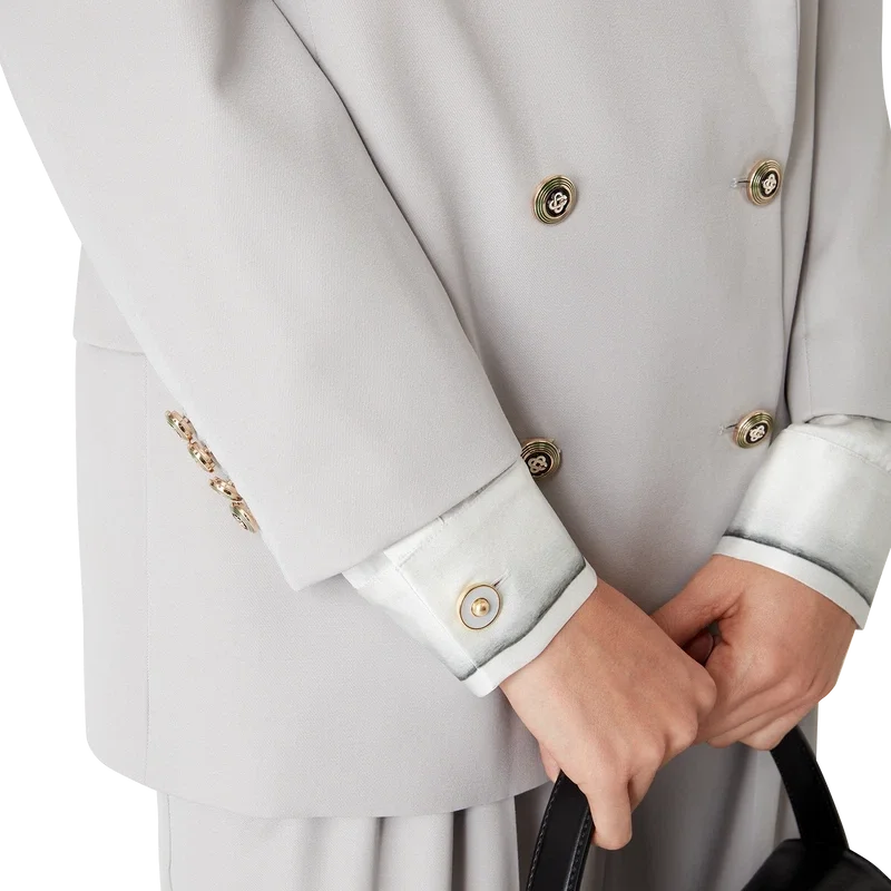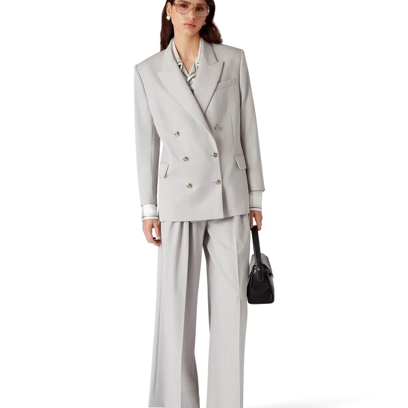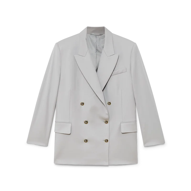 La chaqueta oversize de lana es un diseño de doble botonadura inspirado en Pat Riley; la influencia transformadora que el legendario entrenador de los Lakers tuvo sobre el estilo del baloncesto de los años 80 y 90 se refleja en la ropa deportiva entallada de la colección, confeccionada con tejido de lana virgen. Se completa con solapas en pico, cierre de botones, botones esmaltados CC de vástago plano, un bolsillo de ojal en el pecho y bolsillos delanteros con solapa.