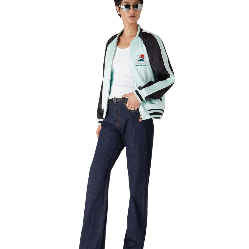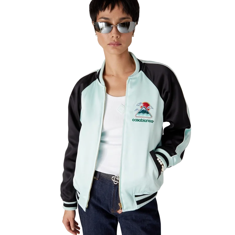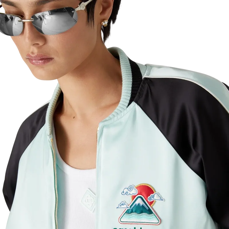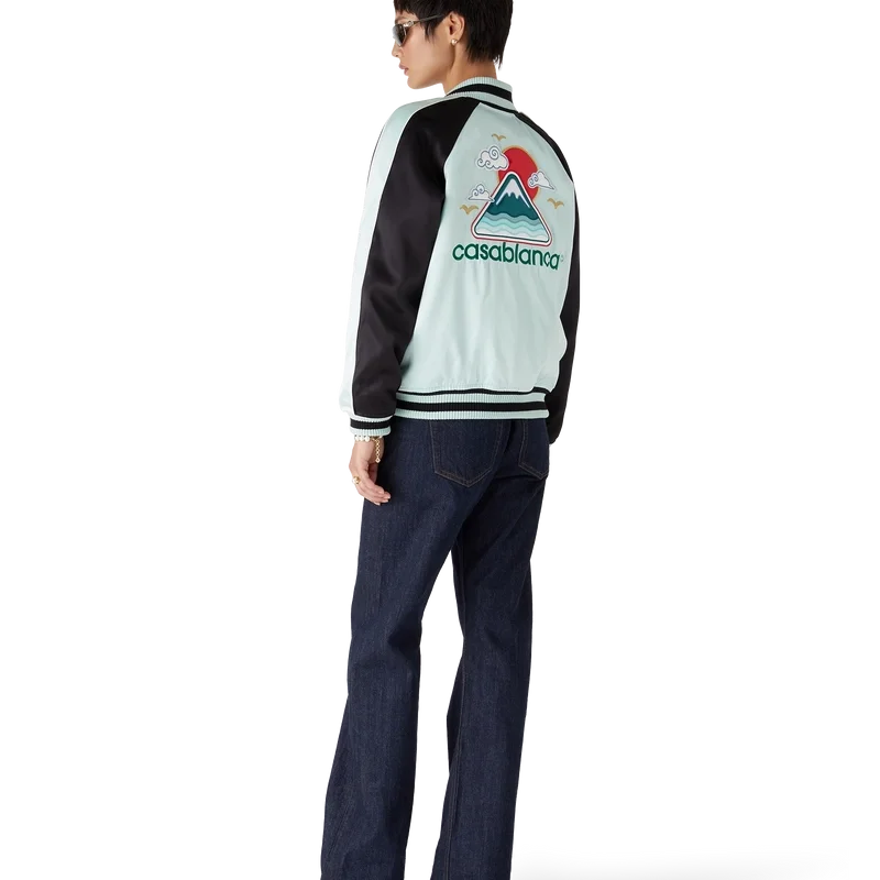 La chaqueta bomber de satén bordada es una chaqueta de estilo bomber tradicional, confeccionada en tejido de satén con un diseño inspirado en la rica iconografía japonesa, que transmite un fuerte mensaje visual con solo unas pocas líneas y colores, lo que la convierte en uno de los emblemas de la colección. Se completa con un cierre de cremallera con la lengüeta con el logotipo del diamante característico de la casa, mangas raglán con paneles verdes y negros y detalles de ribetes, forro, bolsillos diagonales con ribete y cuello, puños y dobladillo acanalados con detalles de rayas en color menta y negro.