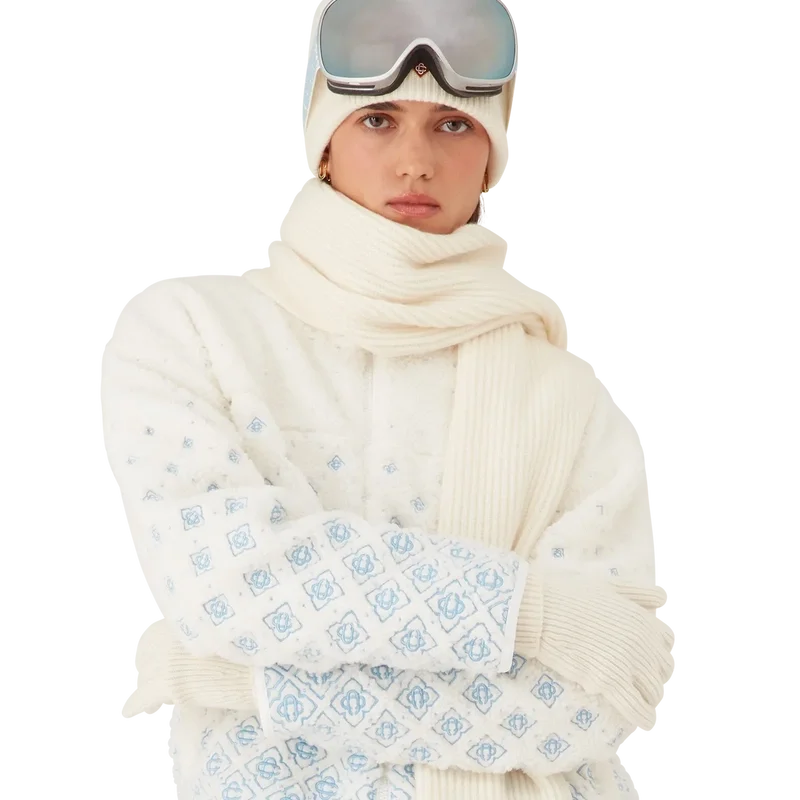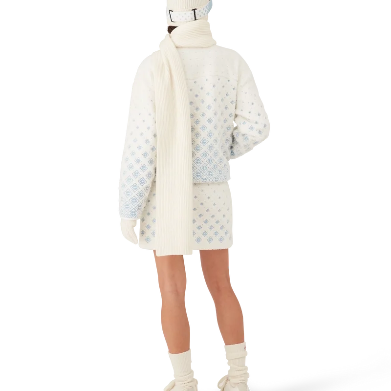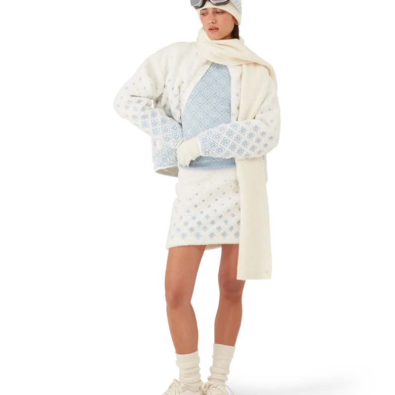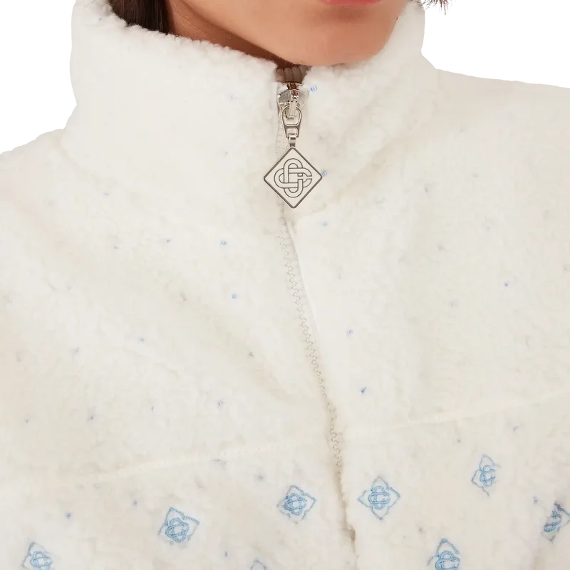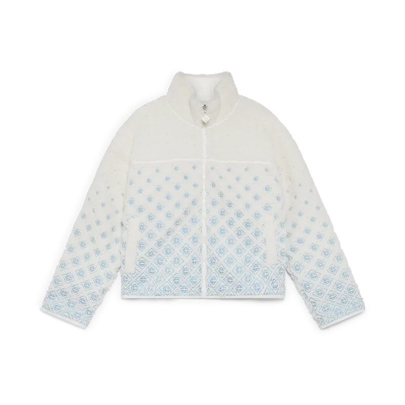 La chaqueta corta de felpa con monograma degradado bordado es una prenda de ropa de abrigo de diseño refinado confeccionada en tejido técnico de felpa en color blanco, inspirada en las texturas aterciopeladas de la legendaria nieve en polvo de Japón. Se inspira en la acogedora comodidad de la vida tradicional en el campo, donde las aguas termales humeantes ofrecen un respiro del frío invernal y la suave nevada amortigua el mundo. Este modelo presenta el diseño del monograma característico de la casa, con cierre de cremallera frontal y tiradores de metal plateados.