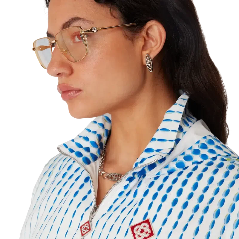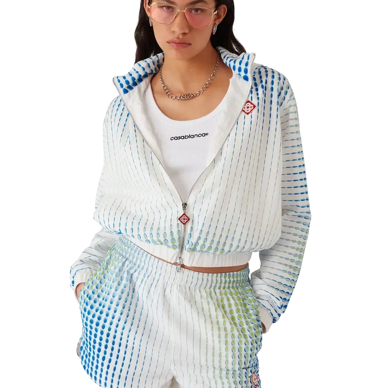 La chaqueta cortavientos Dots es un diseño deportivo confeccionado en tejido de tafetán técnico con el estilo característico de la casa, que presenta motivos degradados y efectos de textura. Se completa con manga larga, capucha con cierre de cordón, puños y dobladillo elásticos, cierre de cremallera con la lengüeta con el diamante característica de la casa y el logotipo del diamante de la casa.