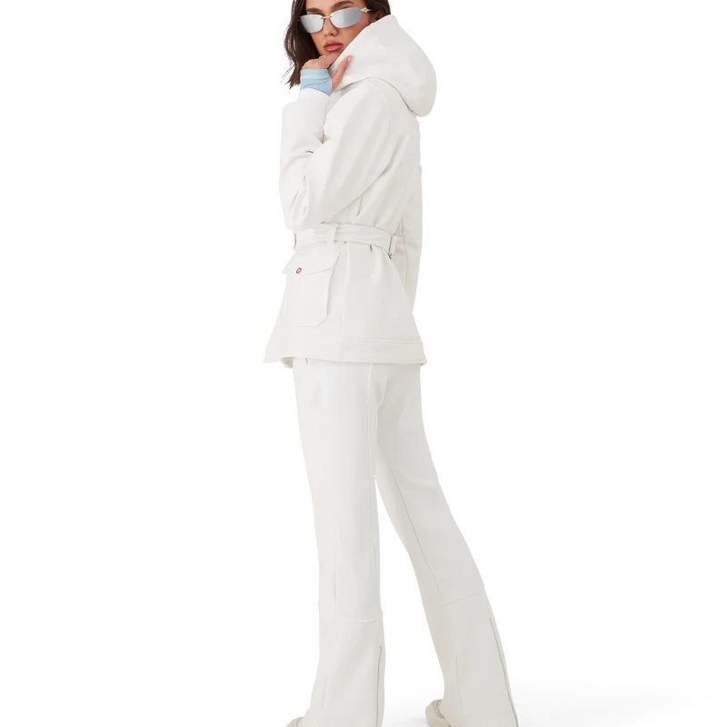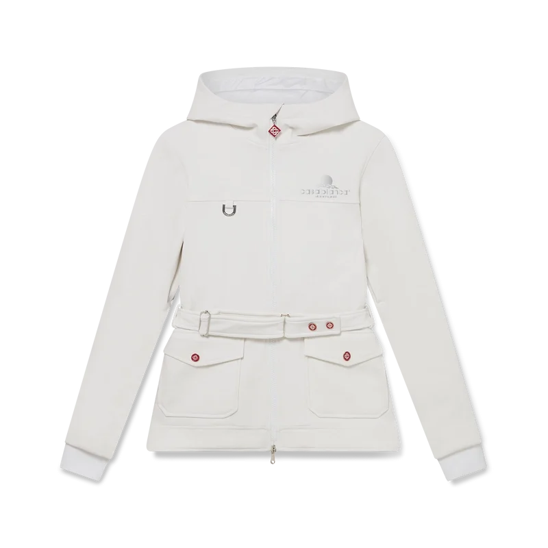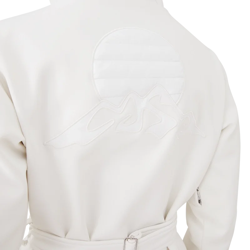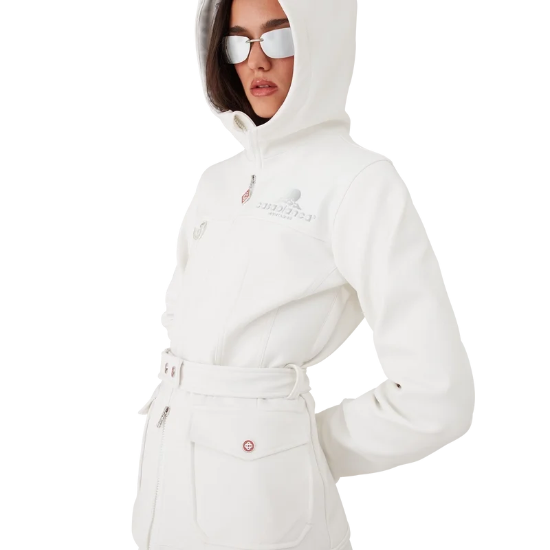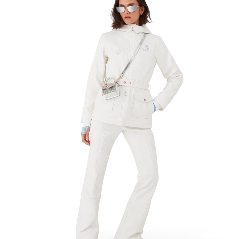 La chaqueta de esquí es una prenda de ropa de abrigo de diseño refinado confeccionada en tejido polar blanco, inspirada en las suaves texturas del paisaje invernal japonés. Los paisajes helados y los bosques de bambú cubiertos de nieve crean serenos pasillos blancos. Este modelo presenta el diseño de temporada Casa Montagne de la casa en la espalda. Se completa con una capucha con cordones y cierres con el logotipo de CC, un cuello alto que proporciona calor adicional y protección contra los elementos, un cierre de cremallera con la lengüeta con el logotipo del diamante característico de la casa, bolsillos delanteros con cierre de herrajes plateados, correas ajustables con la marca y dobladillos y puños elásticos.