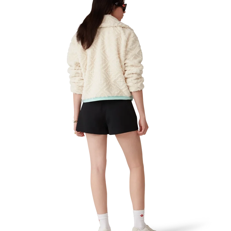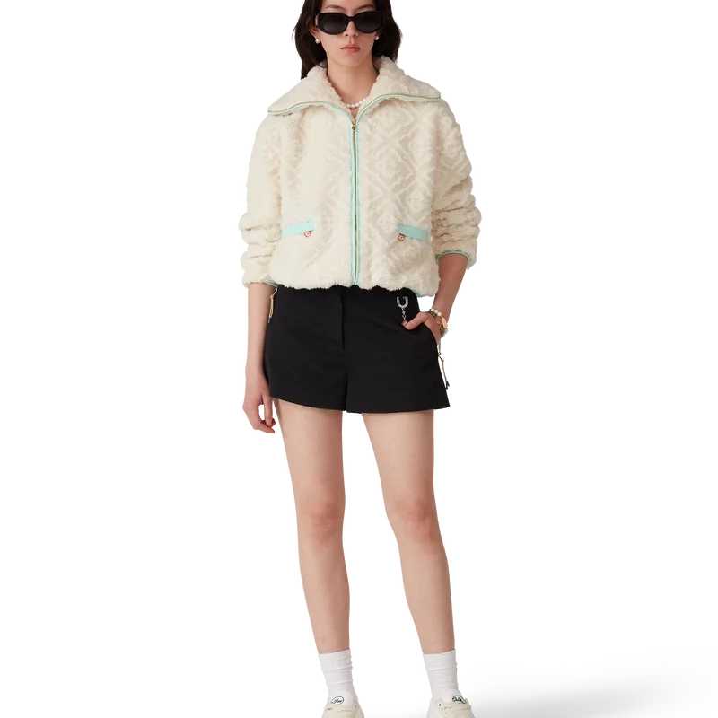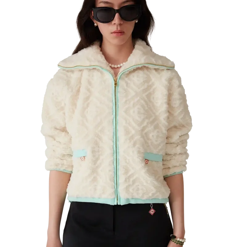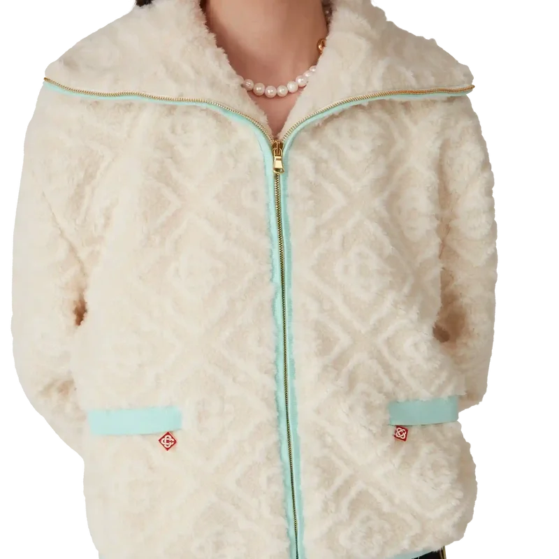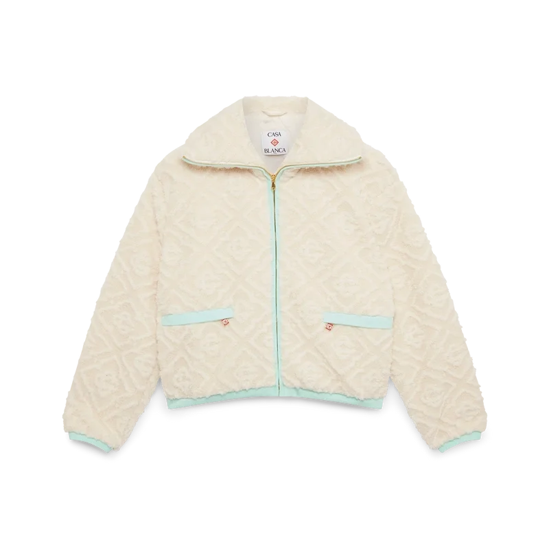 La chaqueta de felpa jacquard con monograma es un diseño de manga larga y textura suave confeccionado en tejido de felpa. Se completa con cuello de embudo, cierre de cremallera con la lengüeta con el logotipo de diamantes característico de la casa, detalles en los puños, el dobladillo y el borde de la capucha en punto elástico de color pastel, y bolsillos con cierre de cremallera.