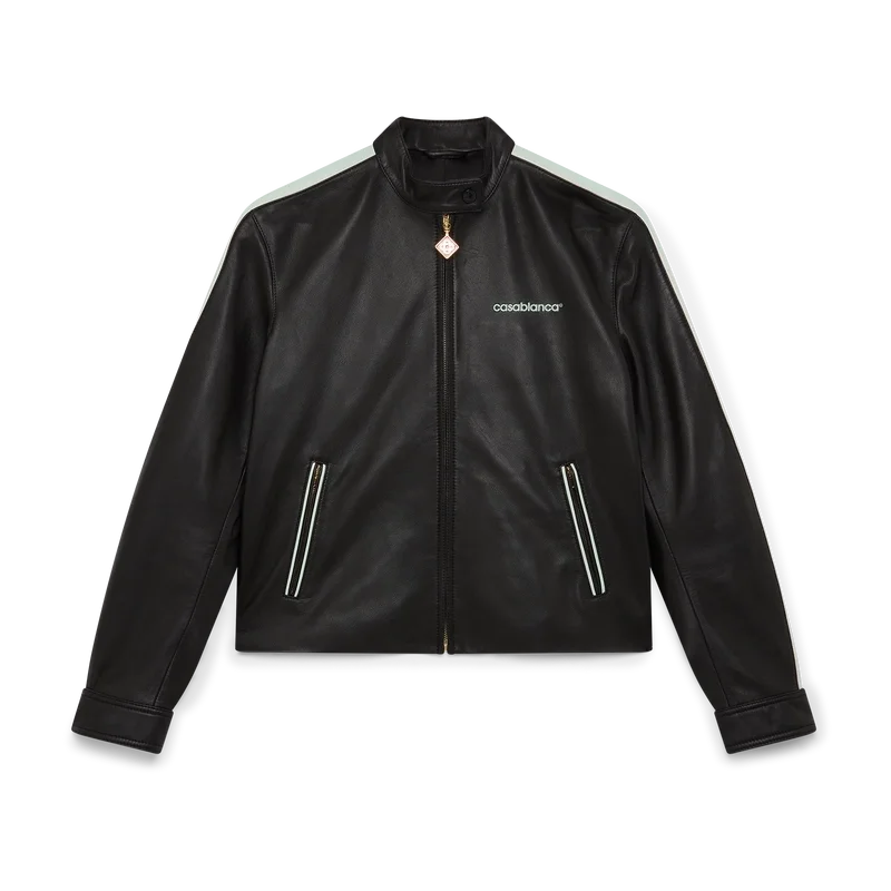 La chaqueta de motociclista de cuero es un diseño deportivo de corte ajustado confeccionado en napa de cordero. Cuenta con cierre de cremallera, bolsillos delanteros inclinados con cierre de cremallera, detalle de rayas en las mangas y el logotipo Casablanca de la casa.