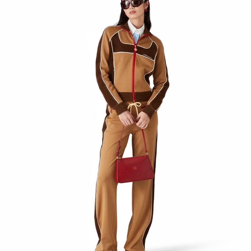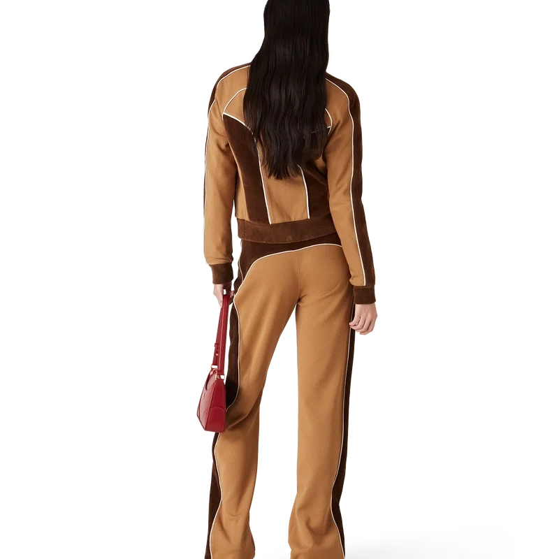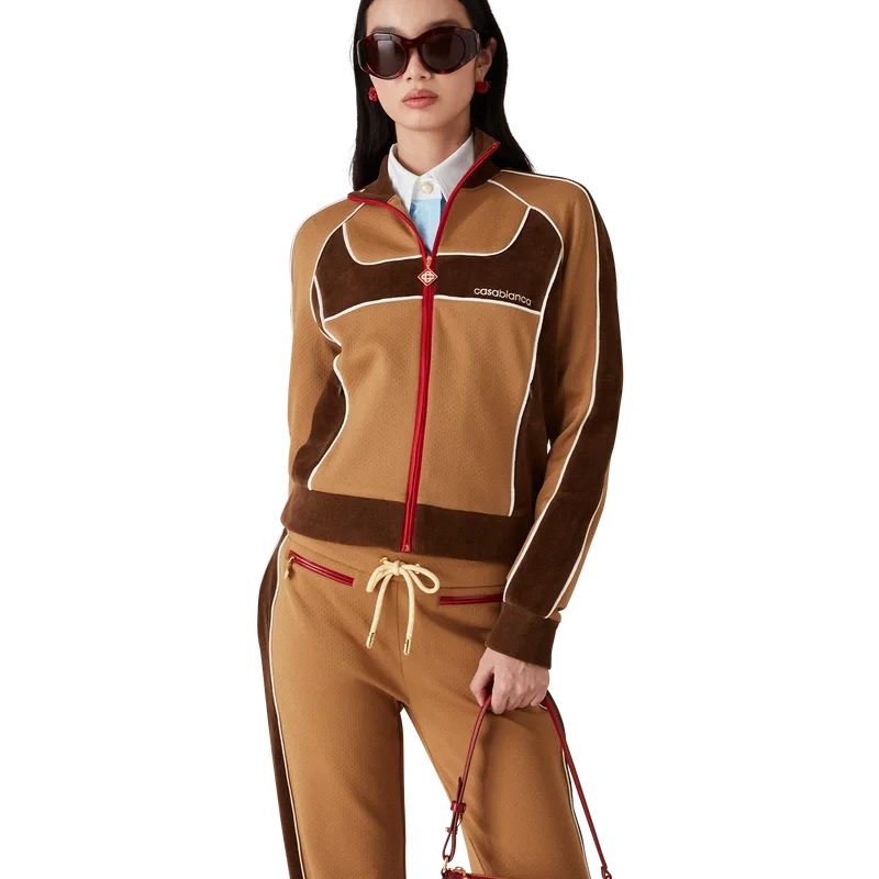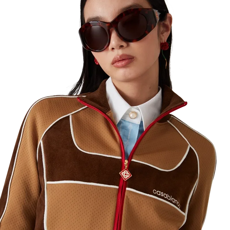 La chaqueta deportiva con paneles de chenilla es un diseño inspirado en la ropa deportiva confeccionado en tejido técnico de terciopelo y cuenta con el logotipo de diamante característico de la casa en la lengüeta de la cremallera. Se completa con cierre de cremallera, paneles con detalles de ribete blanco y cuello, puños y dobladillo acanalados.