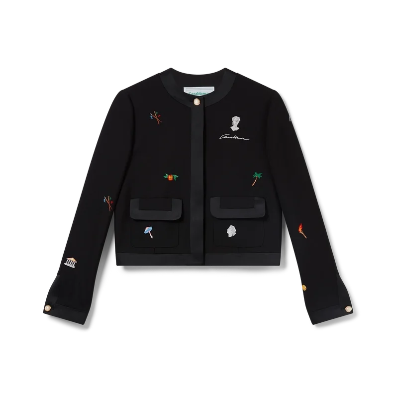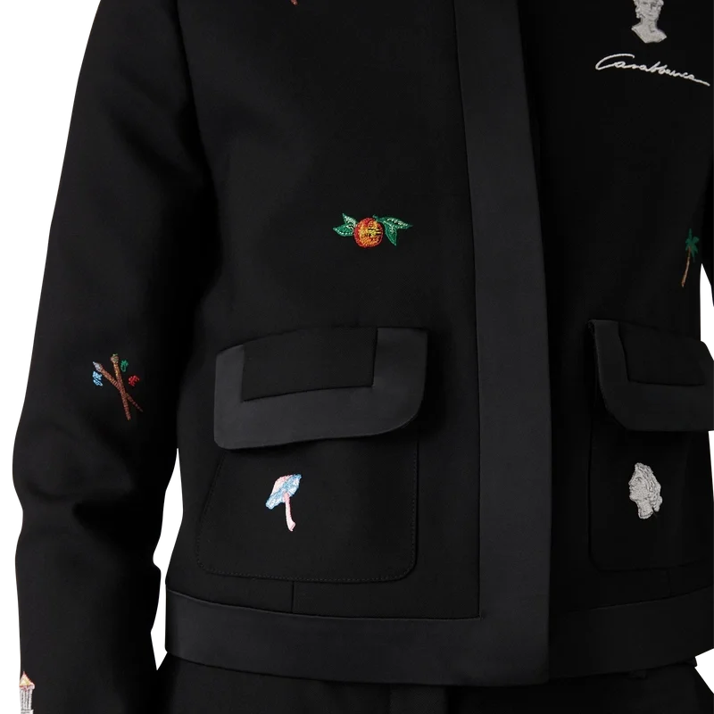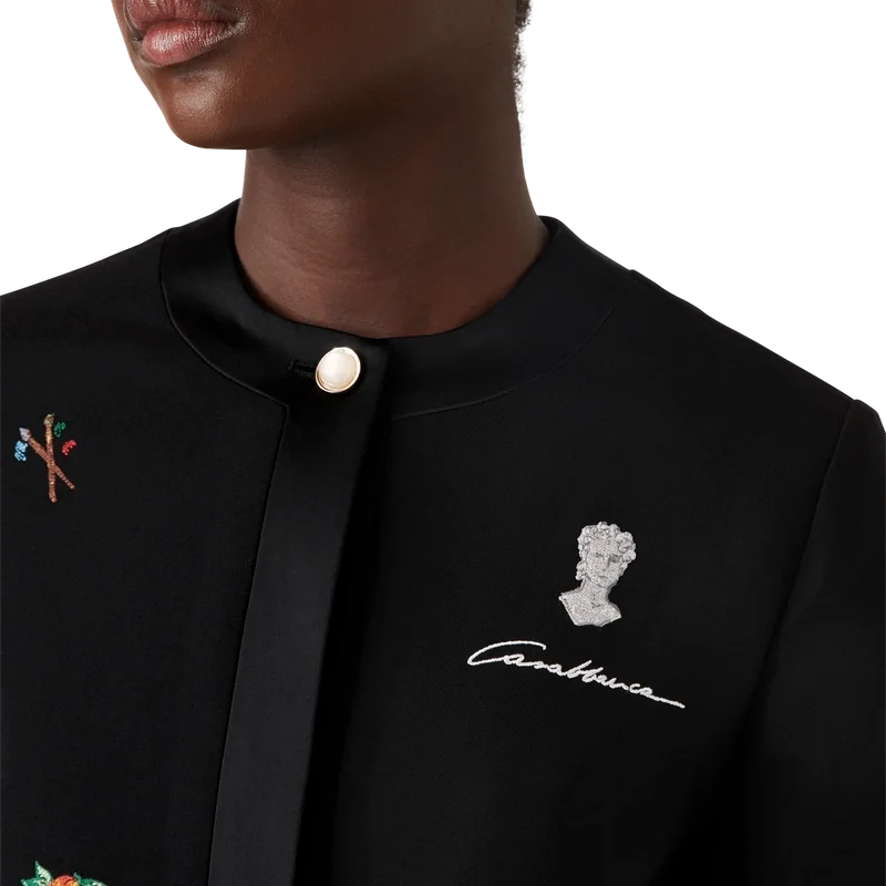 La chaqueta entallada de lana con motivos bordados es un modelo corto confeccionado en tejido de lana bordada. Acabada con motivos bordados que representan la simbología de la casa con la naturaleza y la arquitectura, bolsillos, forro, botón de perla con borde dorado en el cuello, cierre de botones, detalle en los bordes del cuello, tapeta, dobladillo y bolsillos. Diseñada para llevarse con los pantalones entallados a juego.