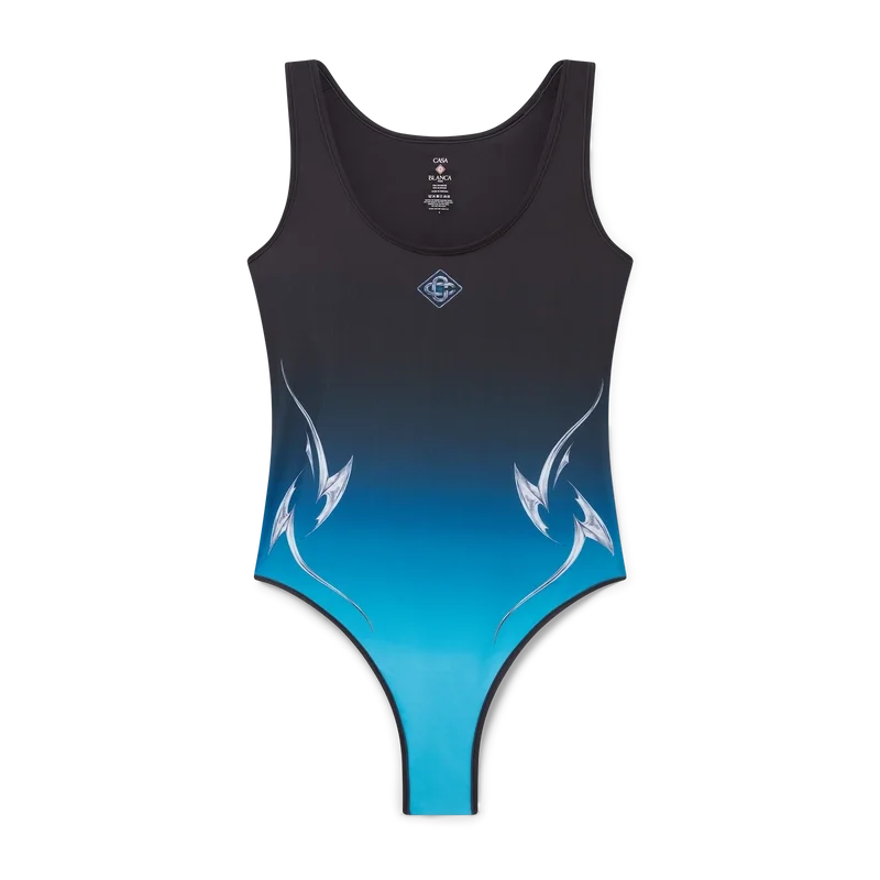 El traje de baño Blades es un diseño estampado confeccionado con un tejido técnico transpirable para trajes de baño, con un estampado que juega con el contraste entre dos sensaciones opuestas: la nitidez de la hoja y el frío cromo plateado, en contraste con la calidez de la naturaleza, como los tonos rosa y rojo intensos de una flor de orquídea. La incorporación del agua aporta un elemento fresco y nítido al diseño. Se completa con un corte alto en las piernas, un cuello redondo, una espalda con aberturas y el logotipo del diamante característico de la casa en el pecho.
