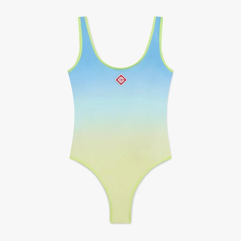 El traje de baño con degradado azul y amarillo es un diseño de una pieza estampado confeccionado en tejido transpirable, con el estampado degradado de la temporada. Se completa con el logotipo de diamante característico de la casa en la parte delantera, cuello redondo, corte alto en las piernas, forro y espalda redondeada con corte bajo.