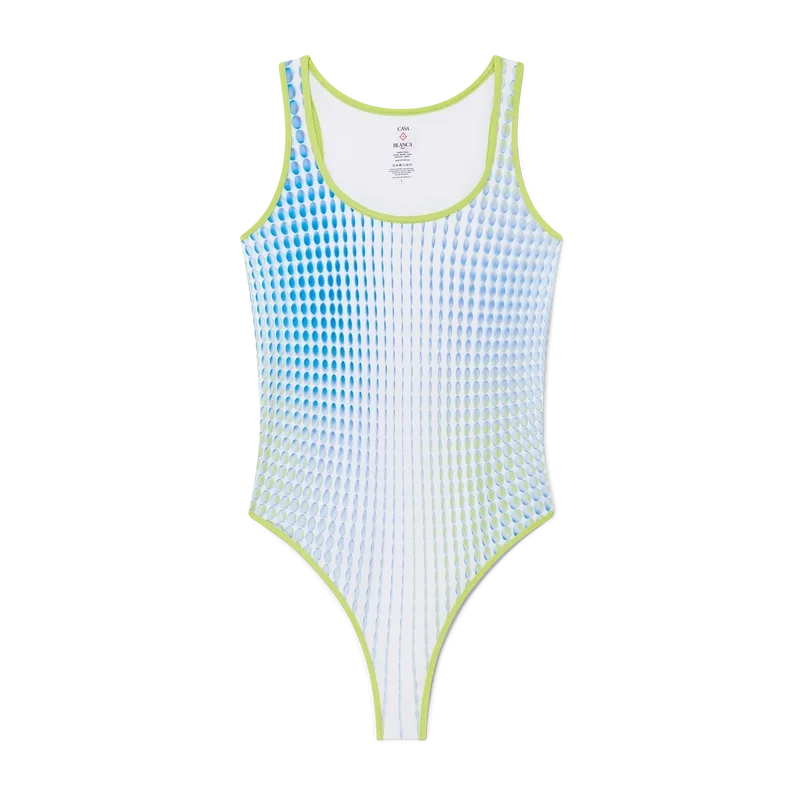 El traje de baño con estampado degradado es un diseño de una pieza que presenta el diseño artístico exclusivo de la temporada, creado en colaboración con Martin Naumann, conocido por su trabajo que combina efectos degradados y de textura con semitonos y efectos similares al vidrio. Rematado con ribete en contraste, corte alto en las piernas, espalda con aberturas y cuello redondo.