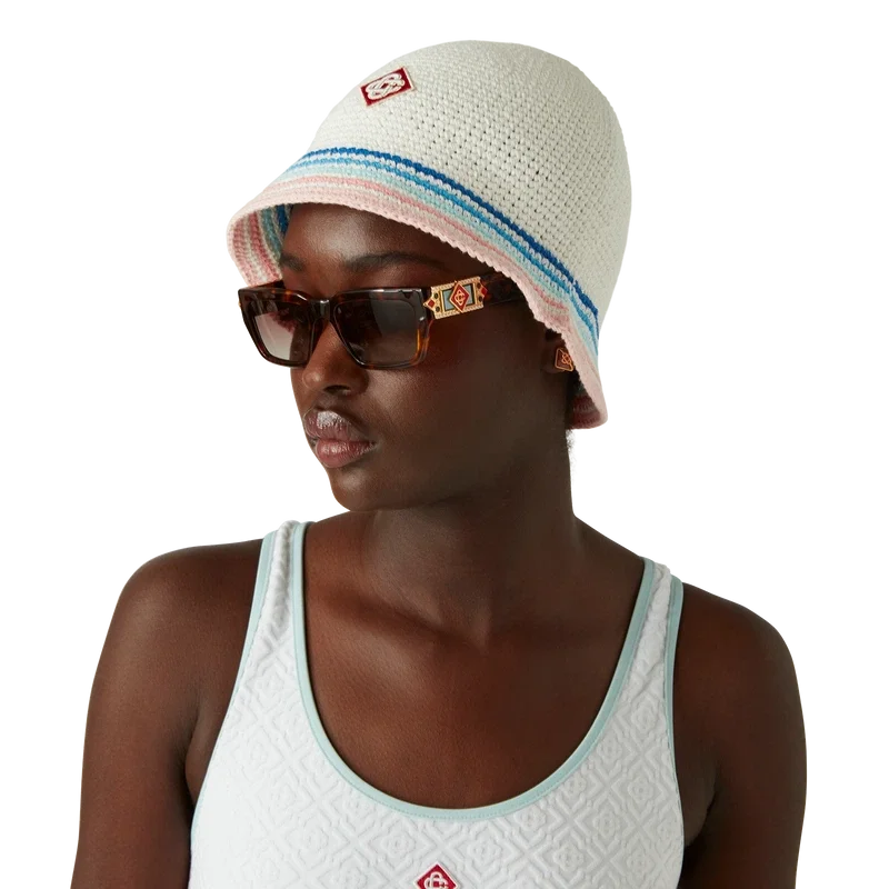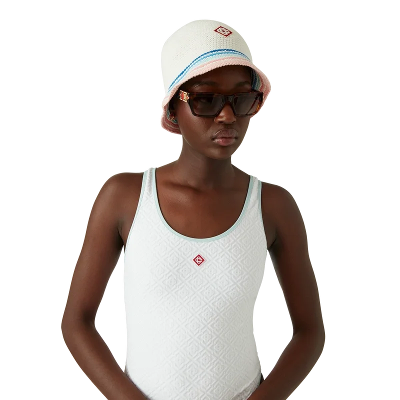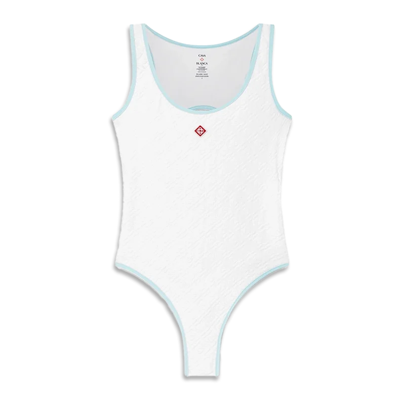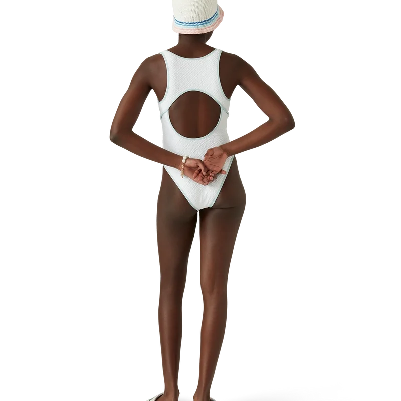 El traje de baño con monograma jacquard es un diseño de una pieza confeccionado en un tejido de mezcla de poliéster transpirable, con el Diamond Monogram característico de la casa. Se completa con detalles de ribete azul, espalda con aberturas y cuello redondo.<!–